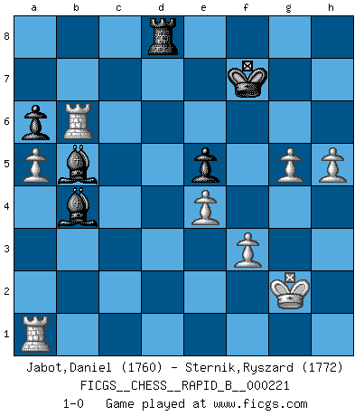 Last move : 1-0 2015 March 15 13:2:4 [Event "FICGS__CHESS__RAPID_B__000221"] [Site "FICGS"] [Date "2014.12.08"] [Round "1"] [White "Jabot,Daniel"] [Black "Sternik,Ryszard"] [Result "1-0"] [WhiteElo "1760"] [BlackElo "1772"] 1.e4 e5 2.Nf3 Nc6 3.Bb5 a6 4.Ba4 Nf6 5.O-O Be7 6.Re1 b5 7.Bb3 d6 8.a4 Bg4 9.c3 O-O 10.h3 Bh5 11.d3 h6 12.Nbd2 b4 13.a5 Qc8 14.Nf1 Qb7 15.Bc4 Bg6 16.Ng3 Bh7 17.Nh4 Bd8 18.Nhf5 Ne7 19.Nxh6+ gxh6 20.Bxh6 Ng6 21.Bxf8 Kxf8 22.Nh5 c6 23.g3 Qd7 24.h4 Nxh5 25.Qxh5 Kg7 26.Qf3 bxc3 27.bxc3 Nf8 28.Reb1 Ne6 29.Qg4+ Kh6 30.Bxe6 Qxe6 31.Qxe6+ fxe6 32.Rb7 d5 33.f3 c5 34.c4 Bg6 35.Rd7 dxc4 36.dxc4 Be8 37.Rd6 Kg7 38.Rxe6 Bf7 39.Rc6 Bxc4 40.Rxc5 Bb5 41.Kg2 Be7 42.Rc7 Kf6 43.g4 Bb4 44.g5+ Kg6 45.Rb7 Rd8 46.Rb6+ Kf7 47.h5 1-0 Ruy Lopez : Closed Kingside Castling by player White (move 5) Kingside Castling by player Black (move 9) Player White won this chess game. Follow this game move after move (download)In Chess, at least, the brave inherit the earth. (Edmar Mednis) Ein unbeabsichtigtes Patt ist der Gipfel der Dummheit. (Anonymous) La señal de un Gran Maestro es su habilidad de ganar una partida rápidamente y sin dolor. (Irving Chernev) Les sacrifices démontrent seulement que quelqu'un a gaffé. (Savielly Tartacover) Life is pleasant. Death is peaceful. It's the transition that's troublesome. (Isaac Asimov)