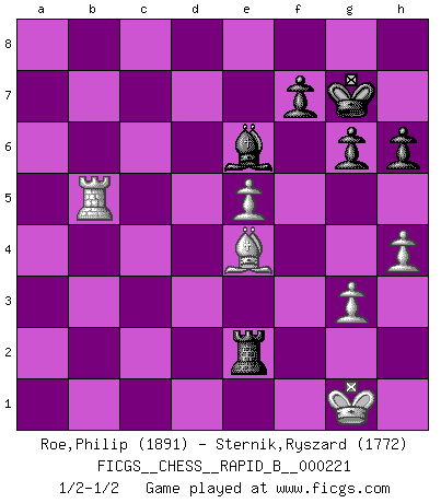 Last move : 1/2-1/2 2015 January 13 23:29:18 [Event "FICGS__CHESS__RAPID_B__000221"] [Site "FICGS"] [Date "2014.12.08"] [Round "1"] [White "Roe,Philip"] [Black "Sternik,Ryszard"] [Result "1/2-1/2"] [WhiteElo "1891"] [BlackElo "1772"] 1.c4 e5 2.Nc3 Nf6 3.Nf3 Nc6 4.g3 Bb4 5.Bg2 O-O 6.O-O e4 7.Ne1 Bxc3 8.bxc3 d5 9.cxd5 Qxd5 10.f3 Rd8 11.e3 Qe5 12.Rb1 Qxc3 13.Qa4 Qa5 14.Qxa5 Nxa5 15.fxe4 c5 16.d4 cxd4 17.exd4 Rxd4 18.e5 Ne4 19.Nc2 Ra4 20.Rf4 Nc3 21.Rxa4 Nxa4 22.Nd4 h6 23.Ba3 Bd7 24.Bd6 Nb6 25.Bc7 Nc6 26.Bxb6 axb6 27.Nxc6 bxc6 28.Rxb6 Rxa2 29.Bxc6 Be6 30.Rb8+ Kh7 31.Be4+ g6 32.Rb5 Kg7 33.h4 Re2 1/2-1/2 English Opening Kingside Castling by player Black (move 5) Kingside Castling by player White (move 6) This chess game ended in a draw. Follow this game move after move (download)We like to think. (Gary Kasparov) Auf Remis zu spielen ist gewissermaßen ein Verbrechen gegen das Schachspiel. (Mikhail Nekhemyevich Tal) Tu puedes aprender mucho mas de una partida que pierdas que de una partida ganada. Tendras que perder cientos de partidas antes de llegar a ser un buen jugador. (Jose Raul Capablanca) Il n'y a plus de joueurs du niveau de Jacob Murray dont la seule quête est le beau jeu, le plaisir de voir les pièces construire quelque chose. Sur 10 idées à la minute, 9 seront sans intérêt, la dernière s'avèrera géniale. (Christian Bauer) It is not true that people stop pursuing dreams because they grow old, they grow old because they stop pursuing dreams. (Gabriel Garcia Marquez)