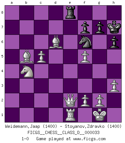 Last move : 1-0 2007 June 4 20:21:17 [Event "FICGS__CHESS__CLASS_D__000033"] [Site "FICGS"] [Date "2007.02.27"] [Round "1"] [White "Weidemann,Jaap"] [Black "Stoyanov,Zdravko"] [Result "1-0"] [WhiteElo "1400"] [BlackElo "1400"] 1.c4 h6 2.d4 d6 3.e4 Nf6 4.Nc3 Nbd7 5.Bd3 e5 6.Nge2 exd4 7.Nxd4 Nc5 8.O-O Be7 9.Bc2 O-O 10.Nf5 Bxf5 11.exf5 a6 12.Bf4 Rb8 13.Re1 b5 14.b4 Ncd7 15.cxb5 axb5 16.h3 Rb6 17.a3 Nh5 18.Qxh5 Nf6 19.Qe2 Re8 20.Nxb5 c6 21.Nd4 c5 22.Ba4 Rf8 23.Nc6 Qa8 24.Nxe7+ Kh7 25.bxc5 Ra6 26.Bb5 Rxa3 27.Rxa3 Qxa3 28.Bxd6 Qb4 29.Nc6 Re8 30.Nxb4 1-0 English Opening Kingside Castling by player White (move 8) Kingside Castling by player Black (move 9) Player White won this chess game. Follow this game move after move (download)Examine moves that smite! A good eye for smites is far more important than a knowledge of strategical principles. (Purdy) Ich bin es gewohnt, das die Jugend mir überhaupt keinen Respekt entgegenbringt. (Alexander Morozewich) Dejen al perfeccionista jugar por correo. (Yasser Seirawan) J'ai toujours senti une vague pitié pour l'homme qui ne connaît rien aux échecs, tout comme j'en aurais pour un homme ignorant de l'amour. Les Echecs, comme la musique ou comme l'amour, ont le pouvoir de rendre heureux. (Siegbert Tarrasch) Work expands to fill the time available. (C. Northcote Parkinson, in Parkinson's Laws)