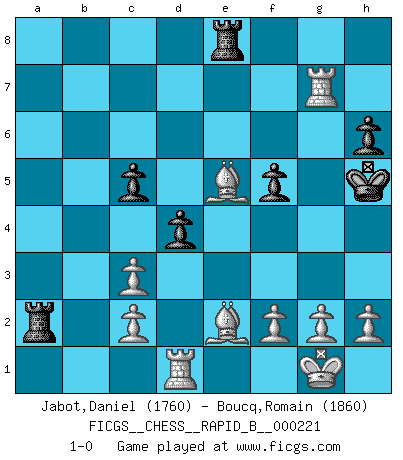 Last move : 1-0 2015 February 11 13:38:7 [Event "FICGS__CHESS__RAPID_B__000221"] [Site "FICGS"] [Date "2014.12.08"] [Round "1"] [White "Jabot,Daniel"] [Black "Boucq,Romain"] [Result "1-0"] [WhiteElo "1760"] [BlackElo "1860"] 1.e4 c5 2.Nf3 Nc6 3.d4 cxd4 4.Nxd4 Nf6 5.Nc3 e5 6.Nxc6 bxc6 7.Bc4 Bb4 8.Bg5 Bb7 9.O-O O-O 10.Qf3 Bxc3 11.bxc3 d5 12.Rab1 Rb8 13.Rfd1 Qd6 14.Bf1 Nxe4 15.Qxe4 f5 16.Qb4 c5 17.Qa5 d4 18.Qxa7 Qc6 19.Rb6 Qe4 20.Be7 Rfe8 21.Bd6 Ra8 22.Qxb7 Qxb7 23.Rxb7 Rxa2 24.Bc4+ Kh8 25.Bxe5 h6 26.Bxg7+ Kh7 27.Be5 Kg6 28.Rg7+ Kh5 29.Be2+ 1-0 Sicilian : Pelikan (Lasker/Sveshnikov) variation Kingside Castling by player White (move 9) Kingside Castling by player Black (move 9) Player White won this chess game. Follow this game move after move (download)In a gambit you give up a Pawn for the sake of getting a lost game. (Samuel Standige Boden) Es ist wirklich schade, dass so viele Schachspieler nicht auf ihr Äußeres achten! (Alexandra Kosteniuk) El Ajedrez expande y enriquece tu mente. (Saudin Robovic) Demandez au pauvre Cg1 ce qu'il en pense. Eduard Gufeld à propos de la variante Saemisch de l'Est-Indienne. Chess is as much a mystery as women. (Purdy)