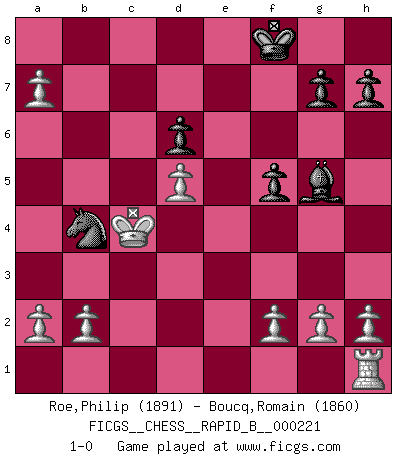 Last move : 1-0 2014 December 30 6:54:7 [Event "FICGS__CHESS__RAPID_B__000221"] [Site "FICGS"] [Date "2014.12.08"] [Round "1"] [White "Roe,Philip"] [Black "Boucq,Romain"] [Result "1-0"] [WhiteElo "1891"] [BlackElo "1860"] 1.e4 c5 2.Nf3 Nc6 3.d4 cxd4 4.Nxd4 Nf6 5.Nc3 e5 6.Ndb5 d6 7.Nd5 Nxd5 8.exd5 Ne7 9.c4 a6 10.Qa4 axb5 11.Qxa8 Nf5 12.Bd2 Nd4 13.Rc1 Be7 14.cxb5 O-O 15.Bd3 f5 16.Ba5 b6 17.Bxb6 Qxb6 18.Rxc8 e4 19.Qa6 Qxa6 20.Rxf8+ Kxf8 21.bxa6 exd3 22.a7 Nc2+ 23.Kd2 Bg5+ 24.Kxd3 Nb4+ 25.Kc4 1-0 Sicilian : Pelikan (Lasker/Sveshnikov) variation Kingside Castling by player Black (move 14) Player White won this chess game. Follow this game move after move (download)If your opponent cannot do anything active, then don't rush the position; instead you should let him sit there, suffer, and beg you for a draw. (Jeremy Silman) Ich war zu klein für die Schach-Schülermannschaft! (Woody Allen) No soy una persona materialista y por eso, no resiento la falta o pérdida del dinero. La ausencia de cosas mundanas carece de importancia. Ya que el Ajedrez es una forma en la que puedo ser tan materialista como yo desee sin tener la necesidad de vender mi alma. (Jamie Walter Adams) La guerre est enfant de la passion, la passion est enfant du narcissisme et le narcissisme est l'enfant. (...) Une autre partie ? (Thibault de Vassal) Once you start thinking you have nothing left to learn, you have everything to learn. (Steve Badget)