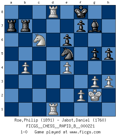Last move : 1-0 2015 February 23 11:39:35 [Event "FICGS__CHESS__RAPID_B__000221"] [Site "FICGS"] [Date "2014.12.08"] [Round "1"] [White "Roe,Philip"] [Black "Jabot,Daniel"] [Result "1-0"] [WhiteElo "1891"] [BlackElo "1760"] 1.e4 c5 2.Nf3 d6 3.Bb5+ Bd7 4.c4 Bxb5 5.cxb5 g6 6.O-O Bg7 7.d4 cxd4 8.Nxd4 Nf6 9.Nc3 O-O 10.Qe2 Nbd7 11.Rd1 Re8 12.Bg5 Rc8 13.Rac1 Qc7 14.h3 Qb8 15.Rc2 Nb6 16.a4 e6 17.a5 Nc4 18.a6 Nd7 19.R2c1 h6 20.Be3 Nxe3 21.Qxe3 bxa6 22.Nc6 Qb7 23.Rxd6 axb5 24.Qxa7 Rc7 25.Nxb5 Qxa7 26.Nbxa7 Ne5 27.b4 Ra8 28.Nb5 Rb7 29.Nba7 g5 30.g3 h5 31.Kg2 Kf8 32.Rcd1 R8xa7 33.Rd8+ 1-0 Sicilian : Canal-Sokolsky attack, 3...Bd7 Kingside Castling by player White (move 6) Kingside Castling by player Black (move 9) Player White won this chess game. Follow this game move after move (download)In Fischer's hands, a slight theoretical advantage is as good a being a Queen ahead. (Isaac Kashdan) Modernes Schach sorgt sich zuviel um Dinge wie Bauernstruktur usw. Vergessen Sie das, Schachmatt beendet das Spiel! (Nigel Short) Prefiero perder una partida realmente buena, que ganar una mala. (David Levy) Ce qui est bien, c'est d'avoir tout un tas de pièces en prise : l'adversaire ne peut en prendre qu'une à la fois. Cité par Thierry Audin. There are 10 types of people in this world: those who understand binary and those who don't. (Anonymous)