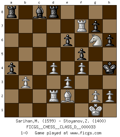 Last move : 1-0 2007 June 13 20:45:48 [Event "FICGS__CHESS__CLASS_D__000033"] [Site "FICGS"] [Date "2007.02.27"] [Round "1"] [White "Sarihan,Mustafa"] [Black "Stoyanov,Zdravko"] [Result "1-0"] [WhiteElo "1599"] [BlackElo "1400"] 1.d4 d5 2.c4 e6 3.Nf3 Bb4+ 4.Bd2 Bxd2+ 5.Nbxd2 dxc4 6.Nxc4 Nf6 7.e3 O-O 8.Rc1 b5 9.Nce5 a6 10.Qc2 h6 11.Qxc7 Nd5 12.Qxd8 Rxd8 13.Be2 f6 14.Nd3 Bb7 15.Nc5 Bc8 16.O-O Nb4 17.a3 N4c6 18.Rfd1 Kf7 19.b3 b4 20.axb4 Nxb4 21.Bc4 Na2 22.Ra1 Nc3 23.Rd2 Nc6 24.Rc1 Ne4 25.Nxe4 f5 26.Nc5 Nb4 27.Ne5+ Kf6 28.Ncd3 Nxd3 29.Bxd3 a5 30.Rc7 a4 31.Rf7+ Kg5 32.f4+ Kh5 33.Be2+ Kh4 34.Ng6+ 1-0 Queen's gambit declined Kingside Castling by player Black (move 7) Kingside Castling by player White (move 16) Player White won this chess game. Follow this game move after move (download)The defensive power of a pinned piece is only imaginary. (Aaron Nimzovich) Wenn man heute mit 14 Jahren noch kein GM ist, kann man es vergessen. (Viswanathan Anand) Por la belleza de sus partidas, la claridad de su juego y lo brillante de sus ideas, Fischer se creó el mismo como un artista de la misma estatura como Brahms, Rembrandt y Shakespeare. (David Levy) Les Echecs, c'est l'art de la guerre sans les charniers, c'est la résurrection des morts tombés au champ d'honneur, l'espoir perpétuel, la suprématie de l'intelligence sur la force, la culture de l'esprit. (F. Szpiner) You can only get smarter by playing a smarter opponent. (Revolver, movie)
