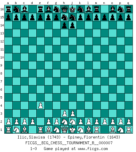 Last move : 1-0 2015 January 9 4:23:5 [Event "FICGS__BIG_CHESS__TOURNAMENT_B__000007"] [Site "FICGS"] [Date "2014.12.09"] [Round "1"] [White "Ilic,Slavisa"] [Black "Epiney,Florentin"] [Result "1-0"] [WhiteElo "1743"] [BlackElo "1643"] 1.e2-e4 1-0 This big chess game has been lost on time (started : 2014.12.09 15:29:57) Follow this game move after move (download)Chess opens and enriches your mind. (Saudin Robovic) Ich weiss nicht was Gott gegen mich auf 1.e4 antworten würde. (Robert James Fischer) El Ajedrez es realmente noventa y nueve por ciento calculación. (Soltis) Si le désir cupide (et stupide) de gagner est une inépuisable source de souffrance, une combinaison brillante sur l'échiquier est une découverte : le coquelicot qui s'épanouit lorsque apparaît la Voie Lactée. (Arrabal) Lottery : A tax on people who are bad at math. (Author unknown)