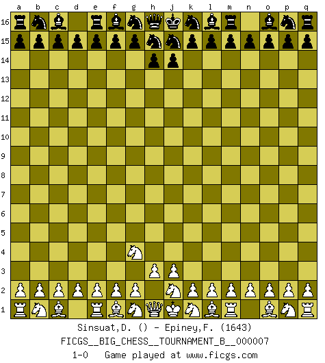 Last move : 1-0 2015 January 8 16:20:7 [Event "FICGS__BIG_CHESS__TOURNAMENT_B__000007"] [Site "FICGS"] [Date "2014.12.09"] [Round "1"] [White "Sinsuat,Datuali"] [Black "Epiney,Florentin"] [Result "1-0"] [WhiteElo ""] [BlackElo "1643"] 1.h2-g4 1-0 This big chess game has been lost on time (started : 2014.12.09 15:29:57) Follow this game move after move (download)Morphy was probably the greatest genius of them all. (Bobby Fischer) Mit sehr nachdenklichem Gesicht schreitet Bobby durch den Turniersaal. Was ist passiert?, fragt Lombardy. Ich stehe schlecht, antwortet Fischer. Lombardy: Dann biete doch einfach Remis an. Fischer: So schlecht stehe ich nun auch wieder nicht! (Robert James Fischer) Con el tiempo, empecé a progresar en partidas decisivas. Tal vez porque me di cuenta de una simple verdad: no solo estaba yo nervioso sino también mi oponente. (Mikhail Tal) La vie est comme un jeu d'échecs : nous esquissons un plan, mais celui-ci est tributaire de ce que daignent faire l'adversaire aux échecs et le destin dans la vie. (Arthur Schopenhauer) Control your own destiny or someone else will. (Jack Welch)
