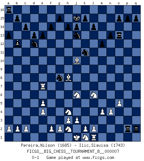 Last move : 0-1 2015 March 9 15:9:53 [Event "FICGS__BIG_CHESS__TOURNAMENT_B__000007"] [Site "FICGS"] [Date "2014.12.09"] [Round "1"] [White "Pereira,Nilson"] [Black "Ilic,Slavisa"] [Result "0-1"] [WhiteElo "1685"] [BlackElo "1743"] 1.j2-h4 j15-h13 2.h1-l4 k16-l14 3.n2-n4 g16-f14 4.d2-d3 h16-q8 5.l4-g8 q8-g8 6.o1-g8 p16-o14 7.c1-k8 e15-e13 8.b1-c3 m15-m13 9.m2-m4 b16-c14 10.l1-p5 n15-n13 11.p5-h12 h15-j13 12.h4-j6 o16-j11 13.h12-j11 h13-j11 14.p1-o3 f14-g12 15.m1-m3 c14-d12 16.q1-l1 o14-n12 17.c3-d5 l14-m12 18.m3-l3 m12-l10 19.k8-j7 f16-b12 20.l3-l9 n12-l13 21.g8-h7 l13-k11 22.l9-l10 j11-l10 23.h7-l10 m16-m14 24.j7-h8 m13-m12 25.g1-j2 d15-d13 26.l10-j8 c15-c14 27.d5-f6 g12-h10 28.j8-k7 m14-p14 29.p2-p3 l16-p12 30.k7-p12 p14-p12 31.j2-h4 e16-e14 32.e2-e4 e14-f14 33.e4-e5 c16-k9 34.e1-e4 k9-e4 35.d3-e4 q16-m16 36.a1-d1 m16-m14 37.o3-n5 m14-o14 38.o2-o4 f14-f9 39.d1-d7 f9-q9 40.d7-b7 a15-a13 41.f1-c4 q9-q2 42.b7-n7 o14-o13 43.n7-l7 l15-l14 44.o4-o5 p12-p3 45.c4-j10 j16-j15 46.l7-e7 f15-f14 47.n5-l6 p3-p2 48.f6-g8 h10-g8 0-1 Follow this game move after move (download)Of all my Russian books, the defense contains and diffuses the greatest 'warmth' which may seem odd seeing how supremely abstract Chess is supposed to be. (Vladimir Nabokov) Ein Schachspiel besteht aus drei Phasen: Die erste, wenn du hofftst den Vorteil zu haben, die zweite, wenn du glaubst einen Vorteil zu haben, und die dritte.... wenn du weißt Du wirst verlieren. (Savielly Grigorievitsch Tartakower) El Ajedrez es tortura mental. (Garry Kasparov) On peut tirer plus d'utilité d'une partie perdue que de 100 parties gagnées. (Capablanca) Hardware: the parts of a computer that can be kicked. (Jeff Persis)