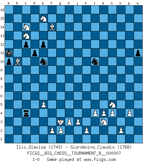 Last move : 1-0 2015 July 20 6:18:51 [Event "FICGS__BIG_CHESS__TOURNAMENT_B__000007"] [Site "FICGS"] [Date "2014.12.09"] [Round "1"] [White "Ilic,Slavisa"] [Black "Giordanino,Claudio"] [Result "1-0"] [WhiteElo "1743"] [BlackElo "1788"] 1.e2-e4 j15-k13 2.j2-h4 h15-g13 3.m2-m4 m15-m13 4.g1-f3 e15-e13 5.p1-o3 d15-d13 6.h2-j4 n15-n13 7.k1-l3 p16-o14 8.b1-c3 l16-p12 9.n2-n4 b16-c14 10.o1-j6 p12-j6 11.h4-j6 c16-l8 12.f3-g5 f16-b12 13.h1-l4 l8-p12 14.c3-d5 h16-p9 15.q1-p1 o16-f8 16.d5-e3 k16-h15 17.e3-g4 g16-j15 18.f1-c4 m16-m14 19.l1-m2 e16-e14 20.d2-d4 e14-f14 21.j4-l5 m14-l14 22.g5-j4 f14-f11 23.j4-h6 f11-j11 24.l4-k5 h15-f14 25.l3-j4 l14-l11 26.j1-k1 j15-l14 27.m2-k4 p9-c9 28.b2-b3 j16-j15 29.c1-g5 c9-f12 30.a1-d1 l14-m12 31.e1-e3 l15-l14 32.e3-f3 f12-a7 33.a2-a4 f14-e12 34.f3-f7 a7-e11 35.e4-e5 f15-f14 36.k1-l1 d13-d12 37.m1-m3 a16-d16 38.g5-h4 d16-d13 39.p1-n1 e12-g11 40.n1-n3 g13-e12 41.o3-n5 d13-c13 42.n3-p3 q15-q13 43.m3-o3 q16-o16 44.j4-g5 o14-n12 45.k5-n8 h14-h13 46.f7-f8 b12-f8 47.n8-f8 l11-l8 48.f8-d6 o15-o14 49.h6-j4 o16-p16 50.p3-p7 e11-b11 51.p7-n7 j11-q11 52.q2-q3 l8-p8 53.p2-p4 p8-q8 54.l1-m2 q8-q3 55.n7-n12 c13-c4 56.n12-p12 c4-c2 57.p12-p6 b11-b3 58.o3-o14 c2-c6 59.d6-l13 j15-h15 60.g4-e3 b3-k11 61.o14-o15 k13-h14 62.p6-p15 p16-p15 63.o15-p15 k11-m11 64.l2-l3 q3-q2 65.l5-m3 m11-q7 66.j4-l5 q7-q6 67.m2-l2 q11-o11 68.l2-k3 g11-j12 69.l13-n15 n13-n12 70.n15-n16 q6-q9 71.l3-l4 q9-q8 72.k4-g7 m12-k13 73.n16-l14 q8-g8 74.g7-n13 o11-k11 75.k3-j2 c6-a6 76.d1-b1 e12-d14 77.b1-b7 g8-g12 78.b7-g7 g12-k9 79.p15-k15 h14-k15 80.l14-k15 k13-j15 81.k15-m13 a6-a4 82.g7-k7 k11-k13 83.m13-o15 k9-m11 84.k7-k13 m11-k13 85.n13-m12 j12-k14 86.h4-o10 k14-l16 87.l5-m7 k13-k16 88.o15-n16 k16-k15 89.n16-a4 j15-k13 90.m12-f6 l16-m14 91.e3-f5 k15-o15 92.o10-n9 q13-q12 93.f5-g7 q12-q11 94.g7-f9 o15-h9 95.j6-l5 h9-d5 96.j2-h2 q2-q1 97.g5-f3 d5-g8 98.f9-d10 g8-b8 99.a4-g10 b8-b1 100.g10-g15 h15-j16 101.h2-g3 b1-b8 102.d10-f11 b8-f12 103.f11-g9 d14-b13 104.g9-h11 f12-g12 105.g15-g12 h13-g12 106.h11-j13 f14-f13 107.m7-l9 k13-j11 108.f6-e7 m14-k13 109.l9-k11 q1-q7 110.e7-c5 d12-d11 111.l5-m7 c14-d12 112.k11-l13 j11-l10 113.n9-h4 e13-e12 114.l13-j14 j16-j15 115.j14-l13 j15-h14 116.j13-k11 d12-e10 117.l13-n12 b13-d12 118.f3-g5 c15-c13 119.g5-h7 c13-c12 120.h7-j9 l10-n11 121.j9-g10 b15-b13 122.h4-n9 h14-h15 123.g10-h12 a15-a13 124.h12-k13 a13-a12 125.n12-l13 b13-b12 126.k11-j13 h15-g16 127.l13-j14 g16-f15 128.k13-h14 f15-e15 129.c5-j11 e15-e14 130.j14-g15 e14-e13 131.j13-g14 e13-d13 132.g15-f13 d12-f13 133.h14-f13 n11-l10 134.f13-e11 d13-d12 135.n9-k6 q7-q8 136.j11-f14 d12-c13 137.e11-f13 c13-d13 138.f13-g15 q8-d8 139.m7-l9 d8-d4 140.g14-e15 d13-d14 141.l9-k11 b12-b11 142.k11-j13 a12-a11 143.j13-g12 a11-a10 144.g12-e13 d4-c4 145.k6-l7 d14-c13 146.g15-e14 c13-b12 147.e13-c14 b12-a12 148.e14-c13 a12-a11 149.l7-h4 b11-b10 150.h4-b10 1-0 This big chess game has been lost on time (started : 2014.12.09 15:29:57) Follow this game move after move (download)Fischer Chess play was always razor-sharp, rational and brilliant. One of the best ever. (Dave Regis) Ich verachte die Medien. (Robert James Fischer) Una partida de Ajedrez se divide en 3 etapas: la primera cuando piensas que tienes la ventaja, la segunda cuando crees que tienes la ventaja y la tercera... ¡cuando te das cuenta que vas a perder!. (Savielly Tartakower) La guerre est enfant de la passion, la passion est enfant du narcissisme et le narcissisme est l'enfant. (...) Une autre partie ? (Thibault de Vassal) War is the child of passion, passion is the child of narcissism and narcissism is the child. (...) Another game ? (Thibault de Vassal)