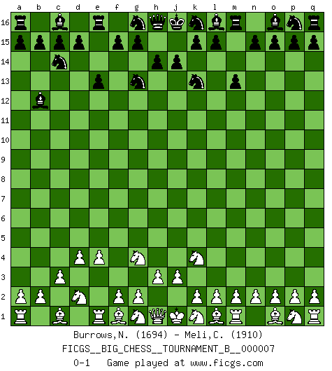 Last move : 0-1 2014 December 21 23:4:2 [Event "FICGS__BIG_CHESS__TOURNAMENT_B__000007"] [Site "FICGS"] [Date "2014.12.09"] [Round "1"] [White "Burrows,Nick"] [Black "Meli,Cosimo Leonardo"] [Result "0-1"] [WhiteElo "1694"] [BlackElo "1910"] 1.e2-e4 j15-k13 2.j2-k4 m15-m13 3.h2-g4 h15-g13 4.d2-d4 e15-e13 5.c2-c3 b16-c14 6.b1-d2 f16-b12 0-1 Follow this game move after move (download)When you play Bobby, it is not a question if you win or lose. It is a question if you survive. (Boris Spassky) Der Freibauer hat für mich eine Seele, genau wie der Mensch, Wünsche, die unerkannt in ihm schlummern, und Befürchtungen, von deren Existenz er selbst kaum ahnt. (Aaron Nimzowitsch) La vida es como un juego de Ajedrez, cambiando con cada movimiento. (Proverbio Chino) Le système Elo représente seulement une moyenne. Il est simplement un indicateur de votre stabilité. (Anatoli Karpov) Do you know these so called Volunteers don't even get paid! (Simpsons)