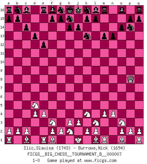 Last move : 1-0 2014 December 21 23:3:48 [Event "FICGS__BIG_CHESS__TOURNAMENT_B__000007"] [Site "FICGS"] [Date "2014.12.09"] [Round "1"] [White "Ilic,Slavisa"] [Black "Burrows,Nick"] [Result "1-0"] [WhiteElo "1743"] [BlackElo "1694"] 1.e2-e4 m15-m13 2.p1-o3 j15-k13 3.b1-c3 e15-e13 4.g1-f3 d15-d13 5.k1-l3 e13-e12 6.m2-m4 c15-c14 7.c3-d5 n15-n13 8.j2-k4 o15-o14 9.d2-d4 p16-n15 10.n2-n4 n15-p14 11.h1-p8 1-0 Follow this game move after move (download)Chess, like love, is infectious at any age. (Flohr) Kostenjuk hat keinen Sexappeal. (Loek van Wely) El Ajedrez es realmente noventa y nueve por ciento calculación. (Soltis) 'L'échange des dames est un coup dur pour les deux adversaires...' Un journaliste lors d'une partie du match Spassky-Fischer I live to kill Traxler counterattack. (Ilmars Cirulis)