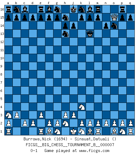 Last move : 0-1 2014 December 10 3:0:2 [Event "FICGS__BIG_CHESS__TOURNAMENT_B__000007"] [Site "FICGS"] [Date "2014.12.09"] [Round "1"] [White "Burrows,Nick"] [Black "Sinsuat,Datuali"] [Result "0-1"] [WhiteElo "1694"] [BlackElo ""] 1.j2-k4 n15-n14 2.h1-o7 j15-h13 3.o7-o15 p16-o14 4.b2-b3 o16-c5 5.e2-e3 q16-p16 6.c1-a3 c5-a3 7.b1-a3 h16-l13 0-1 Follow this game move after move (download)The sign of a great Master is his ability to win a won game quickly and painlessly. (Irving Chernev) Im Wettkampf zwischen starken Meistern kommen Fehler sehr selten vor, deshalb ist es mit bloßem Warten nicht getan. (José Raúl Capablanca) El Ajedrez es la vida. (Bobby Fischer) En blitz, le Cavalier l'emporte sur le Fou. (Vlastimil Hort) A good teacher is like a candle - it consumes itself to light the way for others. (Author unknown)