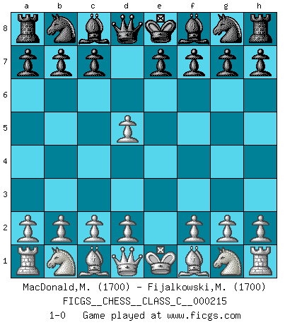 Last move : 1-0 2015 January 19 5:20:1 [Event "FICGS__CHESS__CLASS_C__000215"] [Site "FICGS"] [Date "2014.12.09"] [Round "1"] [White "MacDonald,Murdo"] [Black "Fijalkowski,Marek"] [Result "1-0"] [WhiteElo "1700"] [BlackElo "1700"] 1.e4 d5 2.exd5 1-0 This chess game has been lost on time (started : 2014.12.09 15:51:53) Scandinavian (centre counter) defense Player White won this chess game. Follow this game move after move (download)I love all positions. Give me a difficult positional game, I will play it. But totally won positions, I cannot stand them. (Hein Donner) Ich trinke, ich rauche, ich spiele, ich liebe Frauen aber Fernschach ist ein Laster, das ich nicht habe. (Mikhail Nekhemyevich Tal) ¿Quién es tu oponente esta tarde? Esta tarde mi oponente son las piezas negras. (Akiba Rubinstein) Des points faibles ou des trous dans la position de l'adversaire doivent être occupés par des pièces et non pas par des pions. (Siegbert Tarrasch) Memory... is the diary that we all carry with us. (Oscar Wilde, The Importance of Being Earnest)