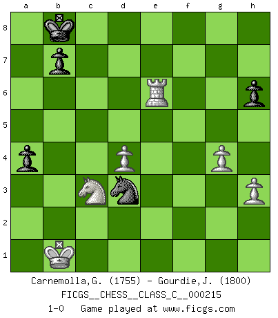 Last move : 1-0 2015 March 7 14:9:34 [Event "FICGS__CHESS__CLASS_C__000215"] [Site "FICGS"] [Date "2014.12.09"] [Round "1"] [White "Carnemolla,Giampaolo"] [Black "Gourdie,Jim"] [Result "1-0"] [WhiteElo "1755"] [BlackElo "1800"] 1.d4 Nc6 2.e4 d5 3.e5 Bf5 4.c3 Nh6 5.Bxh6 gxh6 6.Bd3 Qd7 7.Ne2 O-O-O 8.Na3 Bxd3 9.Qxd3 e6 10.Nc2 Be7 11.Qh3 f6 12.exf6 Bxf6 13.Qxh6 Rdf8 14.f4 Ne7 15.O-O-O Nf5 16.Qh3 Nd6 17.g4 a5 18.Ne3 Kb8 19.Ng3 a4 20.a3 h6 21.Rhe1 Be7 22.Qf1 Rf7 23.Nh5 Bh4 24.Re2 Rg8 25.Ng2 Be7 26.h3 Re8 27.Ne1 Nc4 28.Nd3 Bd6 29.Rde1 Qb5 30.Nb4 Ref8 31.Qg2 Bxf4+ 32.Nxf4 Rxf4 33.Rxe6 Rf2 34.Qxd5 Qxd5 35.Nxd5 Nxb2 36.Re8+ Rxe8 37.Rxe8+ Ka7 38.Nxc7 Nd3+ 39.Kb1 Rb2+ 40.Ka1 Rb3 41.Re6 Rxa3+ 42.Kb1 Rxc3 43.Nb5+ Kb8 44.Nxc3 1-0 Queen's pawn : Lundin (Kevitz-Mikenas) defense Queenside Castling by player Black (move 7) Queenside Castling by player White (move 15) Player White won this chess game. Follow this game move after move (download)A chess genius has died; a loss for humanity. (Viktor Kortchnoi, about Bobby Fischer's death) Mein Gehirn das ist mein zweitwichtigstes Organ [Aus dem Film: Der Schläfer]. (Woody Allen) La maestría del Ajedrez consiste esencialmente en analizar posiciónes de Ajedrez con precisión. (Mikhail Botvinnik) Toutes les manuvres exécutées sur une colonne ouverte ont pour but ultime l'intrusion définitive sur la septième ou la huitième rangée, en plein cur de la position ennemie. (Aaron Nimzovitch) The Movers & Shakers of this world are those who play chess in the mornings and go to the disco in the evenings. (Dinesh De Silva)