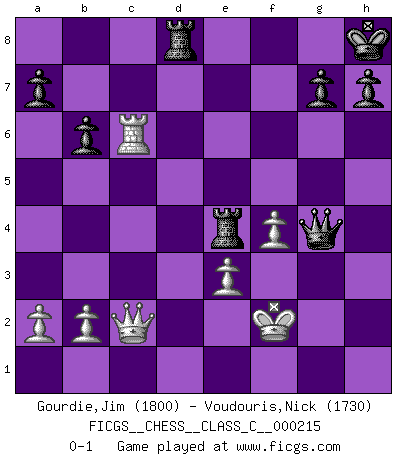 Last move : 0-1 2014 December 26 16:59:5 [Event "FICGS__CHESS__CLASS_C__000215"] [Site "FICGS"] [Date "2014.12.09"] [Round "1"] [White "Gourdie,Jim"] [Black "Voudouris,Nick"] [Result "0-1"] [WhiteElo "1800"] [BlackElo "1730"] 1.d4 d5 2.h3 e6 3.Bf4 Bd6 4.Bh2 f5 5.e3 Nf6 6.Bxd6 Qxd6 7.c4 O-O 8.Nc3 c6 9.c5 Qe7 10.Nf3 Nbd7 11.g4 fxg4 12.hxg4 e5 13.g5 Ng4 14.Rh4 exd4 15.Nxd5 cxd5 16.Rxg4 Nxc5 17.Rxd4 Ne4 18.Bg2 Be6 19.Rc1 Qf7 20.Qe2 Qh5 21.Rc7 Bh3 22.Bxh3 Qxh3 23.Rxe4 dxe4 24.Nd2 Qg2 25.Rc5 b6 26.Rc6 Rad8 27.Qf1 Qxg5 28.Nxe4 Qg4 29.Qc4+ Kh8 30.Qc2 Rf7 31.f4 Re7 32.Kf2 Rxe4 0-1 Queen's pawn game Kingside Castling by player Black (move 7) Player Black won this chess game. Follow this game move after move (download)Chess is in its essence a game, in its form an art, and in its execution a science. (Baron Tassilo) Gewinnen beim Schach fördert das Selbstvertrauen. Beim Sex spüre ich sowas nicht... (Garry Kasparov) Muchos se han convertido en Maestros de Ajedrez, nadie se ha convertido en el Maestro del Ajedrez. (Siegbert Tarrasch) Je fais ceci parce que dans cinquante coups j'obtiendrai cela; je m'appelle Mikhail Moisevitch Botvinnik. (Botvinnik) Wawaweewa ! (Borat: Cultural learnings of America for make benefit glorious nation of Kazakhstan)