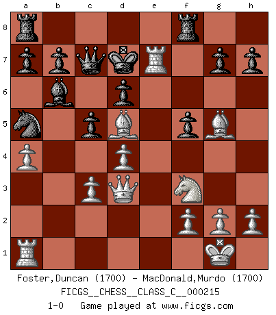 Last move : 1-0 2014 December 21 18:36:52 [Event "FICGS__CHESS__CLASS_C__000215"] [Site "FICGS"] [Date "2014.12.09"] [Round "1"] [White "Foster,Duncan"] [Black "MacDonald,Murdo"] [Result "1-0"] [WhiteElo "1700"] [BlackElo "1700"] 1.e4 e5 2.Nf3 Nc6 3.d4 exd4 4.Bc4 Bc5 5.c3 Qe7 6.O-O Nf6 7.cxd4 Bb6 8.e5 Ne4 9.Bd5 f5 10.Nc3 Nxc3 11.bxc3 Na5 12.a4 c6 13.Ba3 c5 14.Qd3 Rf8 15.Bc1 d6 16.Bg5 Qd7 17.e6 Qc7 18.Rfe1 Bd7 19.exd7+ Kxd7 20.Re7+ 1-0 Scotch gambit Kingside Castling by player White (move 6) Player White won this chess game. Follow this game move after move (download)All I want to do, ever, is just play Chess. (Bobby Fischer) Wie, soll nun auch die Opposition abgeschafft werden? Ja, es tut mir leid, Ihnen diesen Schmerz nicht ersparen zu können. (Aaron Nimzowitsch) Aún el Rey más flojo huye despavorido ante la amenaza de un Jaque doble. (Aaron Nimzowitsch) Nous sommes les pions de la mystérieuse partie d'Echecs jouée par Dieu. Il nous déplace, nous arrête, nous pousse encore, puis nous lance un à un dans la boîte du Néant. Epitaphe sur la tombe de David Janowsky (1868-1927). The bottom line is always the bottom line. (Johann Piek)