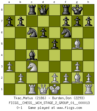 Last move : 0-1 2015 March 5 0:27:2 [Event "FICGS__CHESS__WCH_STAGE_2_GROUP_01__000013"] [Site "FICGS"] [Date "2014.12.09"] [Round "1"] [White "Tkac,Matus"] [Black "Burden,Don"] [Result "0-1"] [WhiteElo "2186"] [BlackElo "2293"] 1.Nf3 c5 2.c4 Nc6 3.d4 cxd4 4.Nxd4 Nf6 5.g3 e5 6.Nb5 Bb4+ 7.N1c3 d6 8.a3 Bxc3+ 9.Nxc3 Be6 10.Bg5 Bxc4 11.Rc1 O-O 12.Bg2 Rc8 0-1 This chess game has been lost on time (started : 2014.12.09 20:1:24) Reti Opening Kingside Castling by player Black (move 11) Player Black won this chess game. Follow this game move after move (download)The stomach is an essential part of the Chess master. (Bent Larsen) Drei Punkte vor allen anderen ist wie einer, der im weißen Anzug posiert, während der Rest in Müllsäcke gekleidet dasteht. (Viktor Kortschnoi) La enorme capacidad mental, en la que sin ella no puede un jugador de Ajedrez existir, es demasiado requerida por el Ajedrez al grado de que nunca podrá liberar su mente de este juego. (Albert Einstein) Horreur, mais aussi harmonie suprême : qu'y avait-il en effet au monde en dehors des échecs ? Le brouillard, l'inconnu, le non-être... (Vladimir Nabokov) It's unlucky to be superstitious. (Dave Enteles)