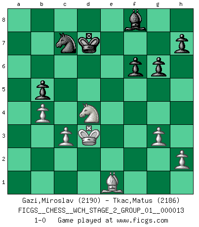 Last move : 1-0 2015 March 20 2:22:8 [Event "FICGS__CHESS__WCH_STAGE_2_GROUP_01__000013"] [Site "FICGS"] [Date "2014.12.09"] [Round "1"] [White "Gazi,Miroslav"] [Black "Tkac,Matus"] [Result "1-0"] [WhiteElo "2190"] [BlackElo "2186"] 1.d4 g6 2.e4 Bg7 3.Nc3 d5 4.Nf3 Nf6 5.e5 Ne4 6.Nxe4 dxe4 7.Ng5 c5 8.f4 Qxd4 9.Qe2 Nc6 10.c3 Qd5 11.Qc4 Qxc4 12.Bxc4 O-O 13.Bd5 Bf5 14.e6 f6 15.Nxe4 c4 16.Nc5 Nd8 17.Be3 Rc8 18.Nd7 Re8 19.Bxa7 Bxe6 20.O-O-O Ra8 21.Bxe6+ Nxe6 22.Be3 Rxa2 23.Nb6 Ra6 24.g3 Nc7 25.Rhe1 e5 26.fxe5 Rxe5 27.Nxc4 Re7 28.Kc2 Rae6 29.Bf2 Rxe1 30.Rxe1 Rxe1 31.Bxe1 Bf8 32.Na5 b5 33.Nc6 Kf7 34.Nd4 Ke8 35.b4 Kd7 36.Kd3 1-0 This chess game has been lost on time (started : 2014.12.09 20:1:24) Modern defense Kingside Castling by player Black (move 12) Queenside Castling by player White (move 20) Player White won this chess game. Follow this game move after move (download)What is the difference between chess and football? Everybody understands football, but nobody plays it. Everybody plays chess, but nobody understands it. Everything is relative. (Vladimir Kramnik) Man wirke der falschen Auffassung entgegen, als ob jeder Zug Unmittelbares zu leisten habe; auch Werte- und Ruhezüge haben ihre Existenzberechtigung. (Aaron Nimzowitsch) Yo he agregado estos principios a la ley: pongan los Caballos en acción antes de que los dos Alfiles sean desarrollados. (Emanuel Lasker) Aidez vos pièces, elles vous aideront. (Paul Morphy) Have no fear of perfection - you'll never reach it. (Salvador Dali)