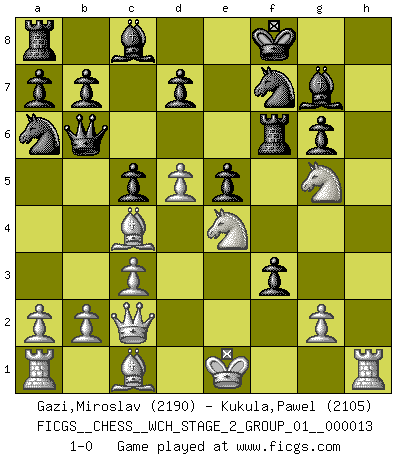 Last move : 1-0 2015 January 26 19:51:10 [Event "FICGS__CHESS__WCH_STAGE_2_GROUP_01__000013"] [Site "FICGS"] [Date "2014.12.09"] [Round "1"] [White "Gazi,Miroslav"] [Black "Kukula,Pawel"] [Result "1-0"] [WhiteElo "2190"] [BlackElo "2105"] 1.d4 Nf6 2.Bg5 c5 3.d5 Ne4 4.Bf4 Qb6 5.Bc1 g6 6.f3 Nd6 7.e4 Bg7 8.c3 O-O 9.h4 f5 10.h5 e6 11.Ne2 fxe4 12.hxg6 hxg6 13.Nf4 Rf6 14.Qc2 e5 15.Nh3 Nf7 16.Nd2 exf3 17.Ne4 Na6 18.Bc4 Kf8 19.Nhg5 1-0 Trompowsky attack (Ruth, Opovcensky Opening) Kingside Castling by player Black (move 8) Player White won this chess game. Follow this game move after move (download)Every Chess master was once a beginner. (Chernev) Mein erstes Ziel war nicht, die Partie zu gewinnen, sondern eine Figur zu opfern. -- der junge (Wilhelm Steinitz) El Ajedrez es el gimnasio de la mente. (Blaise Pascal) La conception d'un plan est le processus par lequel un joueur exploite les avantages de sa position tout en s'efforçant d'en réduire au minimum les inconvénients. Afin de garantir le succès, un plan doit toujours se fonder sur un diagnostic objectif des particularités d'une position. La conception d'un plan est d'autant plus difficile que la position est équilibrée, et grandement facilitée lorsqu'il n'existe qu'un seul plan susceptible de répondre aux exigences de la position. (Harry Golombek) The absolute truth is the thing that makes people laugh. (Carl Reiner)