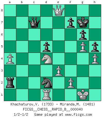 Last move : 1/2-1/2 2007 March 25 23:24:49 [Event "FICGS__CHESS__RAPID_B__000040"] [Site "FICGS"] [Date "2007.02.27"] [Round "1"] [White "Khachaturov,Vadim"] [Black "Miranda,Marcus"] [Result "1/2-1/2"] [WhiteElo "1733"] [BlackElo "1481"] 1.d4 d5 2.c4 e6 3.Nc3 c5 4.cxd5 exd5 5.Nf3 Nc6 6.g3 Nf6 7.Bg2 Be7 8.O-O O-O 9.Bg5 cxd4 10.Nxd4 h6 11.Be3 Re8 12.Qb3 Na5 13.Qc2 Bg4 14.Nf5 Bb4 15.Bd4 Bxc3 16.Bxc3 Nc4 17.e3 Ne5 18.h3 Bh5 19.Qb3 Bg6 20.Nh4 Be4 21.Bxe5 Rxe5 22.Qxb7 a5 23.Qb3 Rb8 24.Qc3 Re7 25.Nf3 Rc7 26.Qxa5 Rxb2 27.Rac1 Rc8 28.Rxc8 Qxc8 29.Nd4 Bxg2 30.Kxg2 Qc4 31.Qd8+ Kh7 32.Qf8 Nh5 33.Re1 Nf6 34.Kg1 Ne4 35.Rf1 Nd2 36.Rd1 Qc7 37.a4 Ra2 38.g4 g6 39.g5 h5 40.Qe8 Kg7 41.h4 1/2-1/2 QGD : Tarrasch, Prague variation, 7...Be7 Kingside Castling by player White (move 8) Kingside Castling by player Black (move 8) This chess game ended in a draw. Follow this game move after move (download)A strong memory, concentration, imagination, and a strong will is required to become a great Chess player. (Bobby Fischer) Vielleicht wirkt die Aura früherer Spieler glanzvoller als die der heutigen Spieler, aber das liegt daran, dass man kein Programm wie Fritz hatte, das einem all die Löcher in ihren Partien zeigt. (Vladimir Kramnik) Después de una mala apertura, hay una esperanza en el juego medio. Pero una vez que estas en finales, el momento de la verdad ha llegado. (Edmar Mednis) Les erreurs sont comme les malheurs, elles n'arrivent jamais seules. (Siegbert Tarrasch) Hello Thibault, if I have had a plan (and I had one, I hope), I have forgotten it during the last week... - Hello Heinz-Georg. What do you mean a plan ? (Anonymous players, during a Big Chess game)
