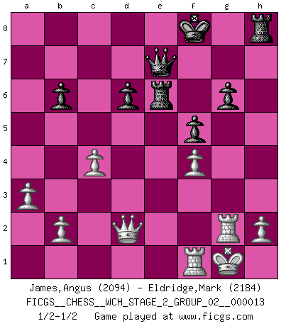 Last move : 1/2-1/2 2015 May 10 23:52:9 [Event "FICGS__CHESS__WCH_STAGE_2_GROUP_02__000013"] [Site "FICGS"] [Date "2014.12.09"] [Round "1"] [White "James,Angus"] [Black "Eldridge,Mark"] [Result "1/2-1/2"] [WhiteElo "2094"] [BlackElo "2184"] 1.e4 c5 2.Nf3 d6 3.d4 cxd4 4.Nxd4 Nf6 5.Nc3 a6 6.Be3 e5 7.Nb3 Be6 8.f3 h5 9.Nd5 Bxd5 10.exd5 g6 11.Qd2 Nbd7 12.Be2 Bg7 13.O-O b6 14.c4 Qc7 15.Rac1 O-O 16.Na1 h4 17.Nc2 Nh5 18.Nb4 a5 19.Nc6 Nf4 20.Bd1 h3 21.g3 Ng2 22.Bh6 Rae8 23.Bxg7 Kxg7 24.f4 exf4 25.gxf4 f5 26.Rc3 Rh8 27.Nd4 Nc5 28.Bc2 Qd8 29.a3 a4 30.Rg3 Kf7 31.Ne6 Nxe6 32.dxe6+ Rxe6 33.Bxa4 Kf8 34.Bc6 Qe7 35.Bxg2 hxg2 36.Rxg2 1/2-1/2 Sicilian : Najdorf, Byrne (English) attack Kingside Castling by player White (move 13) Kingside Castling by player Black (move 15) This chess game ended in a draw. Follow this game move after move (download)Man is a frivolous, a specious creature, and like a Chess player, cares more for the process of attaining his goal than for the goal itself. (Dostoyevsky) Sehr viele beherrschen heutzutage das große Einmalseins des Schachspiels und kennen sogar dessen Logarithmentafeln auswendig - deshalb sollte man hin und wieder zu beweisen trachten, dass zwei mal zwei auch fünf sein kann. (Mikhail Nekhemyevich Tal) Cuando tengas duda... ¡juega al Ajedrez!. (Tevis) Il vaut mieux sacrifier les pièces de l'adversaire. (Xavier Tartacover) Do not put your faith in what statistics say until you have carefully considered what they do not say. (William W. Watt)