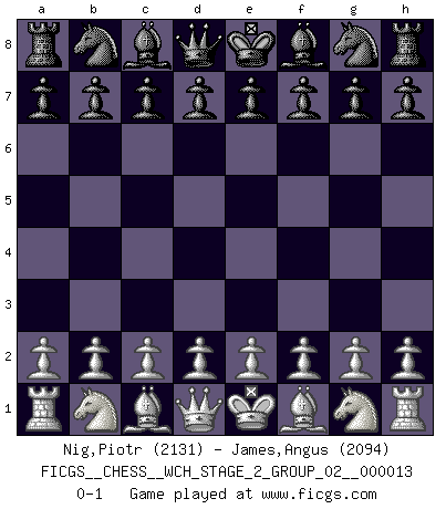 Last move : 0-1 2015 January 9 4:23:5 [Event "FICGS__CHESS__WCH_STAGE_2_GROUP_02__000013"] [Site "FICGS"] [Date "2014.12.09"] [Round "1"] [White "Nig,Piotr"] [Black "James,Angus"] [Result "0-1"] [WhiteElo "2131"] [BlackElo "2094"] 0-1 This chess game has been lost on time (started : 2014.12.09 20:1:21) Player Black won this chess game. Follow this game move after move (download)Daring ideas are like Chess men moved forward. They may be beaten, but they may start a winning game. (Johann Wolfgang von Goethe) Die Fehler sind da, Sie warten nur darauf gemacht zu werden. (Savielly Grigorievitsch Tartakower) No puedes jugar al Ajedrez si eres de corazón noble. (Proverbio Francés) Ce n'est pas pour s'amuser qu'il joue aux échecs : il célèbre un culte. (Vladimir Nabokov) Live, lose, and learn, by observing your opponent how to win. (Amber Steenbock)