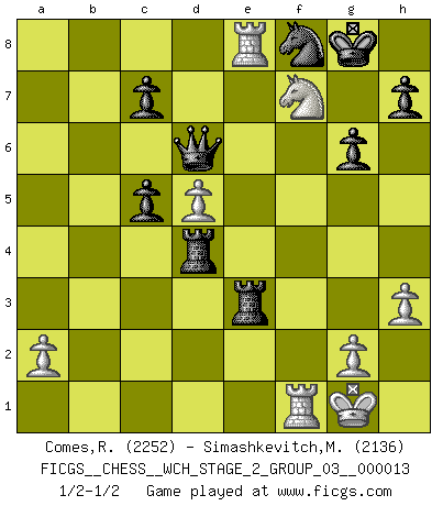 Last move : 1/2-1/2 2015 May 8 15:49:23 [Event "FICGS__CHESS__WCH_STAGE_2_GROUP_03__000013"] [Site "FICGS"] [Date "2014.12.09"] [Round "1"] [White "Comes,Ruben"] [Black "Simashkevitch,Mykola"] [Result "1/2-1/2"] [WhiteElo "2252"] [BlackElo "2136"] 1.e4 e5 2.Nf3 Nc6 3.Bb5 Nf6 4.d3 Bc5 5.c3 O-O 6.O-O d6 7.Nbd2 a6 8.Bxc6 bxc6 9.d4 exd4 10.cxd4 Bb6 11.Qc2 Re8 12.Re1 c5 13.d5 Bg4 14.b3 Ba5 15.Re3 Bxf3 16.Nxf3 Qe7 17.Bd2 Bxd2 18.Nxd2 Ng4 19.R3e1 a5 20.h3 Ne5 21.Re3 Reb8 22.f4 Ng6 23.Rf1 a4 24.bxa4 Rb4 25.a5 Rxa5 26.e5 dxe5 27.Nc4 R5a4 28.Nxe5 Rxf4 29.Rfe1 Qd6 30.Nd3 Rfd4 31.Re8+ Nf8 32.Rb1 Rac4 33.Qe2 g6 34.Rf1 Rh4 35.Qe3 Rcd4 36.Ne5 Rhe4 37.Nxf7 Rxe3 1/2-1/2 Ruy Lopez : Berlin defense Kingside Castling by player Black (move 5) Kingside Castling by player White (move 6) This chess game ended in a draw. Follow this game move after move (download)The passed pawn is a criminal, who should be kept under lock and key. Mild measures, such as police surveillance, are not sufficient. (Nimzovitch) Ich verstehe den Grund nicht, warum die Aufteilung in Frauen und Männer überhaupt im Schach besteht. (Judith Polgar) Un Peón pasado es un criminal, quién debe ser mantenido bajo candado y llave. Leves medidas, tales como vigilancia policiaca, no son suficientes. (Aaron Nimzovich) Mon pion favori sur ma case favorite ! Bronstein en parlant d'un coup de pion en h5 quand il avait les Noirs. Perseverance does not equal worthiness. Next time you want to get my attention, wear something fun. Low-riding jeans are hot. (Gregory House, House M.D.)