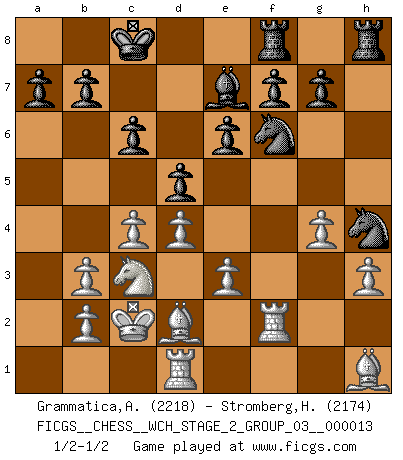 Last move : 1/2-1/2 2015 January 21 8:52:34 [Event "FICGS__CHESS__WCH_STAGE_2_GROUP_03__000013"] [Site "FICGS"] [Date "2014.12.09"] [Round "1"] [White "Grammatica,Andrea"] [Black "Stromberg,Hakan"] [Result "1/2-1/2"] [WhiteElo "2218"] [BlackElo "2174"] 1.d4 d5 2.c4 c6 3.Nf3 Nf6 4.e3 Bg4 5.Qb3 Qb6 6.Nc3 e6 7.Nh4 Bh5 8.h3 Be7 9.g4 Bg6 10.Nxg6 hxg6 11.Bg2 g5 12.Bd2 Nbd7 13.O-O-O Qxb3 14.axb3 O-O-O 15.Rhf1 Nf8 16.f4 gxf4 17.Rxf4 Ng6 18.Rf2 Rdf8 19.Kc2 Nh4 20.Bh1 Ng6 21.Bg2 Nh4 22.Bh1 1/2-1/2 QGD Slav : 4.e3 Queenside Castling by player White (move 13) Queenside Castling by player Black (move 14) This chess game ended in a draw. Follow this game move after move (download)Good offense and good defense both begin with good development. (Bruce A. Moon) Besser ein falscher Plan, logisch durchgeführt, als gar kein Plan. (Viktor Kortschnoi) Un juego de Ajedrez es un dialogo, una conversación entre un jugador y su oponente. Cada movimiento del oponente puede contener amenazas o tropiezos, pero un jugador no se puede defender de las amenazas o tomar ventaja de los tropiezos si es que no se pregunta a sí mismo: ¿Que es lo que mi oponente va a hacer después de cada movida?. (Bruce A. Moon) Une platitude souvent récitée à propos des Echecs est qu'une des choses les plus difficiles à réaliser est de gagner une position gagnante. Cela ne manque pas de sens mais, pour ma part, j'ai toujours trouvé plus difficile de gagner une position perdante. (Tim Krabbe) Everything in life is luck. (Donald Trump)