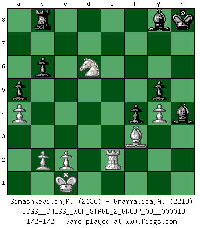 Last move : 1/2-1/2 2015 May 1 20:23:22 [Event "FICGS__CHESS__WCH_STAGE_2_GROUP_03__000013"] [Site "FICGS"] [Date "2014.12.09"] [Round "1"] [White "Simashkevitch,Mykola"] [Black "Grammatica,Andrea"] [Result "1/2-1/2"] [WhiteElo "2136"] [BlackElo "2218"] 1.e4 c5 2.Nf3 Nc6 3.d4 cxd4 4.Nxd4 Qb6 5.Nb3 Nf6 6.Nc3 e6 7.Qe2 Bb4 8.Bd2 O-O 9.a3 Be7 10.O-O-O d5 11.e5 Ne8 12.f4 f6 13.Be3 Qc7 14.exf6 Bxf6 15.Nb5 Qb8 16.Kb1 a6 17.N5d4 Nd6 18.g4 Qc7 19.Bg2 Nc4 20.f5 a5 21.a4 Nxe3 22.Qxe3 Nxd4 23.Nxd4 exf5 24.Nb5 Qe7 25.Bxd5+ Kh8 26.Qxe7 Bxe7 27.Rhe1 Bh4 28.Rf1 f4 29.Rd4 g5 30.Bf3 Rb8 31.Nd6 Be6 32.Re4 Rf6 33.Rd1 h5 34.h3 b6 35.Kc1 Bg8 36.Rd2 hxg4 37.hxg4 Re6 38.Rxe6 Bxe6 39.Re2 Bg8 1/2-1/2 Sicilian defense Kingside Castling by player Black (move 8) Queenside Castling by player White (move 10) This chess game ended in a draw. Follow this game move after move (download)What is the object of playing a gambit opening?... To acquire a reputation of being a dashing player at the cost of losing a game. (Siegbert Tarrasch) Die Arbeit ist etwas Unnatürliches. Die Faulheit allein ist göttlich. (Anatole France) No hay precio que no valga la pena por la cabellera del Rey enemigo. (Koblentz) Tout change constamment, y compris dans le monde des Echecs. (Botvinnik) Perhaps the current trend of many chess professionals taking up the more lucrative pastime of poker is not a wholly negative one. It may not be too late for humans to relearn how to take risks in order to innovate and thereby maintain the advanced lifestyles we enjoy. And if it takes a poker-playing supercomputer to remind us that we can't enjoy the rewards without taking the risks, so be it. (The Chess Master and the Computer, by Garry Kasparov - 2010)