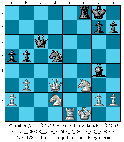 Last move : 1/2-1/2 2015 March 6 9:19:17 [Event "FICGS__CHESS__WCH_STAGE_2_GROUP_03__000013"] [Site "FICGS"] [Date "2014.12.09"] [Round "1"] [White "Stromberg,Hakan"] [Black "Simashkevitch,Mykola"] [Result "1/2-1/2"] [WhiteElo "2174"] [BlackElo "2136"] 1.e4 e5 2.Nf3 Nc6 3.Bb5 Nf6 4.d3 Bc5 5.Bxc6 dxc6 6.Nbd2 Nd7 7.Nc4 f6 8.O-O Nf8 9.c3 Be6 10.b3 Qd7 11.d4 exd4 12.cxd4 Be7 13.Be3 Ng6 14.Qc2 O-O 15.Rac1 a5 16.Ne1 f5 17.f3 fxe4 18.fxe4 Rxf1+ 19.Kxf1 b5 20.Nd2 Rf8+ 21.Nef3 c5 22.d5 Bg4 23.Kg1 c6 24.Bxc5 cxd5 25.Bxe7 Qxe7 26.exd5 Nf4 27.Re1 Qa7+ 28.Kf1 Nxd5 29.Qd3 Qc5 30.Re5 Qc1+ 31.Re1 Qc6 32.Re5 Qc1+ 33.Re1 Qc6 1/2-1/2 Ruy Lopez : Berlin defense Kingside Castling by player White (move 8) Kingside Castling by player Black (move 14) This chess game ended in a draw. Follow this game move after move (download)I won't play with you anymore. You have insulted my friend. - When an opponent cursed himself for a blunder. (Miguel Najdorf) Als er Schachweltmeister wurde ließ er praktisch alle stärksten Sovietspieler für sich arbeiten. Wenn ein auch nur mittelmässiger Meister ein Spezialist für eine bestimmte Eröffnung war, wurde er von Karpov gerufen. Das wurde alles geheim gehalten. (Mikhail Moiseyevich Botvinik) Me siento como si fuera una pieza en una partida de Ajedrez, cuando mi oponente me indica: esa pieza no puede ser movida. (Soren Kierkegaard) Il s'avisa de me proposer d'apprendre les échecs qu'il jouait un peu... me voilà forcené des échecs. J'achète un échiquier, je m'enferme dans ma chambre, j'y passe des jours et des nuits à vouloir apprendre par cur toutes les parties. (Jean-Jacques Rousseau, Confessions) Knowledge will give you power, but character respect. (Bruce Lee)