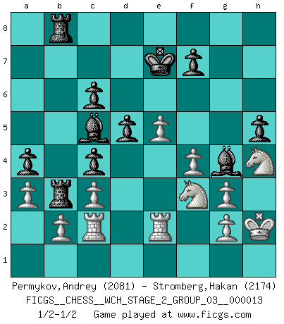 Last move : 1/2-1/2 2015 February 11 16:46:20 [Event "FICGS__CHESS__WCH_STAGE_2_GROUP_03__000013"] [Site "FICGS"] [Date "2014.12.09"] [Round "1"] [White "Permykov,Andrey"] [Black "Stromberg,Hakan"] [Result "1/2-1/2"] [WhiteElo "2081"] [BlackElo "2174"] 1.e4 e5 2.Nf3 Nc6 3.d4 exd4 4.Nxd4 Bb4+ 5.c3 Bc5 6.Be3 Bb6 7.Qg4 Nf6 8.Qxg7 Rg8 9.Qh6 d5 10.Bb5 Bd7 11.Bxc6 bxc6 12.e5 Rg6 13.Qh4 Ng4 14.Qxd8+ Rxd8 15.Bf4 c5 16.Nf3 c4 17.Bg3 Nh6 18.Nh4 Rc6 19.O-O Nf5 20.Rc1 Nxg3 21.hxg3 a5 22.Nd2 Ra8 23.Ndf3 a4 24.a3 Bc5 25.Rc2 Rb6 26.Rd1 c6 27.R1d2 Kf8 28.Nd4 Re8 29.f4 Bg4 30.Kh2 Reb8 31.Ndf3 Ke7 32.Re2 h5 33.Kh1 R6b7 34.Kh2 Rb3 1/2-1/2 Scotch game Kingside Castling by player White (move 19) This chess game ended in a draw. Follow this game move after move (download)Many have become Chess Masters, no one has become the Master of Chess. (Siegbert Tarrasch) Die Idee von Capablanca, Schach als Fach in den Schulen zu lehren, ist großartig. (Fidel Castro) En la perfecta combinación de Ajedrez como en una historia corta de primera clase, toda la trama y contra trama deberá conducir hacia un final sorprendente, el interes no es mitigado hasta el último momento. (Yates and Winter) D'abord les bases : Jouez et étudiez, puis étudiez et jouez, ensuite jouez et étudiez, puis étudiez et jouez. Deuxièmement : Donnez toujours le meilleur de vous-même ! (Ken Smith) Don't be irreplaceable, if you can't be replaced, you can't be promoted. (Dan Rotaru)