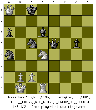 Last move : 1/2-1/2 2015 February 12 20:32:41 [Event "FICGS__CHESS__WCH_STAGE_2_GROUP_03__000013"] [Site "FICGS"] [Date "2014.12.09"] [Round "1"] [White "Simashkevitch,Mykola"] [Black "Permykov,Andrey"] [Result "1/2-1/2"] [WhiteElo "2136"] [BlackElo "2081"] 1.e4 c5 2.Nf3 d6 3.d4 cxd4 4.Nxd4 Nf6 5.Nc3 a6 6.Be3 e6 7.f3 b5 8.Qd2 Nbd7 9.g4 b4 10.Nce2 h6 11.O-O-O Qc7 12.h4 d5 13.Bf4 e5 14.Bh2 dxe4 15.g5 hxg5 16.hxg5 Rxh2 17.Rxh2 exd4 18.Rh8 Nd5 19.Qxd4 Bb7 20.fxe4 N5b6 21.Qxb4 O-O-O 22.Qb3 Bxe4 23.a4 Bd6 24.Rxd8+ Kxd8 25.Nc3 Nc5 26.Qa2 Bf3 27.Be2 Bxe2 28.Nxe2 Qe7 29.Nc3 Qxg5+ 30.Kb1 Qf4 31.Ne2 Qe5 32.Qxf7 Nbxa4 33.Nd4 Kc8 34.Qa7 g5 35.Qa8+ Kc7 36.Qa7+ Kc8 37.Qa8+ 1/2-1/2 Sicilian : Najdorf, Byrne (English) attack Queenside Castling by player White (move 11) Queenside Castling by player Black (move 21) This chess game ended in a draw. Follow this game move after move (download)Castle early and often. (Rob Sillars) Je mehr wir mit Computern analysieren, desto mehr glauben wir an Verteidigung. (Vladimir Kramnik) Los problemas de Ajedrez exigen del compositor las mismas virtudes que caracterizan todo el arte de valor: originalidad, invención, concisión, armonía, complejidad e insinceridad explendida. (Vladimir Nabokov) C'est la seule position que je connaisse où les deux camps sont mals. Propos prêtés à V. Anand. History is the quarrels of popes and kings, with wars or pestilences in every page; the men all so good for nothing, and hardly any women at all. (Jane Austen)