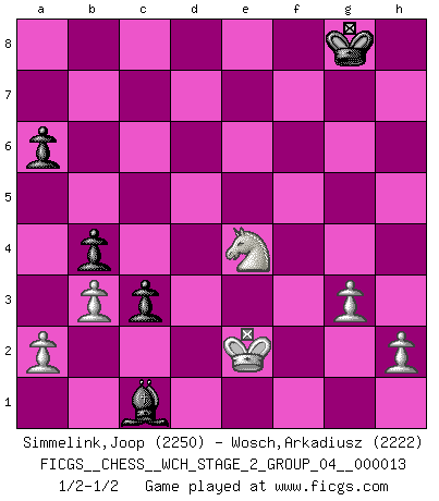 Last move : 1/2-1/2 2015 March 28 15:8:12 [Event "FICGS__CHESS__WCH_STAGE_2_GROUP_04__000013"] [Site "FICGS"] [Date "2014.12.09"] [Round "1"] [White "Simmelink,Joop"] [Black "Wosch,Arkadiusz"] [Result "1/2-1/2"] [WhiteElo "2250"] [BlackElo "2222"] 1.d4 Nf6 2.c4 e6 3.Nf3 d5 4.Nc3 c6 5.Bg5 h6 6.Bxf6 Qxf6 7.e3 Nd7 8.Bd3 dxc4 9.Bxc4 g6 10.O-O Bg7 11.Qc2 O-O 12.Ne4 Qe7 13.Bb3 e5 14.Ng3 Kh8 15.Rad1 f5 16.dxe5 Nxe5 17.Nxe5 Qxe5 18.Rd2 Be6 19.Rfd1 Rae8 20.Bxe6 Qxe6 21.Qa4 a6 22.Rd6 Qf7 23.Qb4 f4 24.exf4 Qxf4 25.Qxf4 Rxf4 26.Rxg6 Bd4 27.Rxh6+ Kg8 28.Nh5 Bxf2+ 29.Kf1 R4f8 30.Rf6 Bh4 31.Rf4 b5 32.g3 Bg5 33.Rxf8+ Rxf8+ 34.Ke2 Rf5 35.Rf1 Re5+ 36.Kf3 c5 37.Rf2 c4 38.Nf4 Re1 39.Nd5 Re5 40.Nc3 b4 41.Ne4 Rf5+ 42.Kg2 Rxf2+ 43.Kxf2 Bc1 44.b3 c3 45.Ke2 1/2-1/2 Queen's pawn game Kingside Castling by player White (move 10) Kingside Castling by player Black (move 11) This chess game ended in a draw. Follow this game move after move (download)Chess, like love, like music, has the power to make people happy. (Siegbert Tarrasch) Als ich elf wurde, wurde ich einfach gut. (Robert James Fischer) Ciertamente el estado mental actual de Bobby Fischer es una tragedia. Uno de los mas grandes jugadores de Ajedrez del mundo -el orgullo y pena del Ajedrez Americano. (Frank Brady) La tactique, c'est ce que vous faites quand il y a quelque chose à faire; la stratégie, c'est ce que vous faites quand il n'y a rien à faire. (Savielli Tartacower) Every now and then a man's mind is stretched by a new idea and never shrinks back to its former dimensions. (Oliver Wendell Holmes, Sr.)