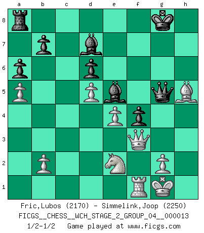 Last move : 1/2-1/2 2014 December 18 16:7:25 [Event "FICGS__CHESS__WCH_STAGE_2_GROUP_04__000013"] [Site "FICGS"] [Date "2014.12.09"] [Round "1"] [White "Fric,Lubos"] [Black "Simmelink,Joop"] [Result "1/2-1/2"] [WhiteElo "2170"] [BlackElo "2250"] 1.d4 Nf6 2.c4 g6 3.Nc3 Bg7 4.e4 d6 5.Nf3 O-O 6.Be2 e5 7.O-O Nc6 8.d5 Ne7 9.Ne1 Nd7 10.Be3 f5 11.f3 f4 12.Bf2 g5 13.Rc1 Ng6 14.Nd3 Nf6 15.c5 Rf7 16.a4 h5 17.a5 g4 18.Nb5 a6 19.Nc3 g3 20.hxg3 fxg3 21.Bxg3 h4 22.Bh2 Nh5 23.f4 Nhxf4 24.Bh5 Qg5 25.Nxf4 h3 26.Nxh3 Bxh3 27.Qe2 Rxf1+ 28.Rxf1 Nf4 29.Qf3 Bd7 30.cxd6 cxd6 31.Bxf4 exf4 32.Ne2 Be5 1/2-1/2 King's Indian : Orthodox, Aronin-Taimanov variation (Yugoslav attack / Mar del Plata variation) Kingside Castling by player Black (move 5) Kingside Castling by player White (move 7) This chess game ended in a draw. Follow this game move after move (download)Chess is a forcing house where the fruits of character can ripen more fully than in life. (Edward Morgan Foster) Drei Punkte vor allen anderen ist wie einer, der im weißen Anzug posiert, während der Rest in Müllsäcke gekleidet dasteht. (Viktor Kortschnoi) Siempre es mejor sacrificar los hombres de tu oponente. (Savielly Tartakower) Le pion, dans sa simplicité, marche droit devant lui, mais lorsqu'il prend, il le fait obliquement? Ainsi l'homme, tant qu'il reste pauvre, marche dans la droiture et vit honnêtement, mais lorsqu'il recherche les honneurs, il flatte, se parjure et, par les voies obliques, cherche une position supérieure sur l'échiquier du monde. (Jean de Galles) You know what they say : You lie down with the Devil, you wake up in Hell. (Horatio Caine, C.S.I. Miami)