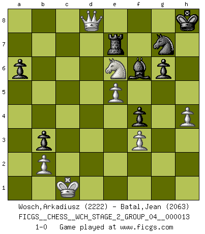 Last move : 1-0 2015 March 12 22:55:1 [Event "FICGS__CHESS__WCH_STAGE_2_GROUP_04__000013"] [Site "FICGS"] [Date "2014.12.09"] [Round "1"] [White "Wosch,Arkadiusz"] [Black "Batal,Jean"] [Result "1-0"] [WhiteElo "2222"] [BlackElo "2063"] 1.e4 g6 2.d4 Bg7 3.Nc3 d6 4.Be3 a6 5.Qd2 b5 6.f3 Nd7 7.O-O-O Bb7 8.h4 h5 9.Nh3 Rc8 10.Ng5 c5 11.dxc5 Nxc5 12.Bd4 Nf6 13.Kb1 O-O 14.g4 e5 15.Bxc5 dxc5 16.gxh5 Nxh5 17.Nd5 Rc6 18.Bh3 Kh8 19.Qe3 f5 20.Rhg1 Qe8 21.Rge1 Bc8 22.a3 f4 23.Qc3 Bxh3 24.Nxh3 Qf7 25.Re2 Qb7 26.Ng5 Re8 27.Red2 Bf8 28.Qb3 Ng7 29.c4 b4 30.axb4 cxb4 31.c5 Bxc5 32.Nxf4 exf4 33.Rd7 Rc7 34.Qf7 Rxd7 35.Rxd7 Qxd7 36.Qxd7 Be7 37.Ne6 b3 38.Kc1 Bf6 39.e5 Re7 40.Qd8+ 1-0 Robatsch (Modern) defense Queenside Castling by player White (move 7) Kingside Castling by player Black (move 13) Player White won this chess game. Follow this game move after move (download)Chess is 99 percent tactics. (Teichmann) Ein Gewinn durch eine ungenaue Kombination, sei sie auch noch so vorzeigbar, erfüllt mich mit Schaudern. (Wilhelm Steinitz) Fischer era un maestro de claridad y un Rey del posicionamiento astuto. Sus oponentes podían ver hacia donde se dirigía pero eran impotentes para detenerlo. (Bruce Pandolfini) On croit qu'il y a plus de mauvais joueurs que de bons joueurs, c'est faux : Il y a autant de joueurs qui gagnent que de joueurs qui perdent. (Philippe Geluck) Opportunities multiply as they are seized. (Sun Tzu)