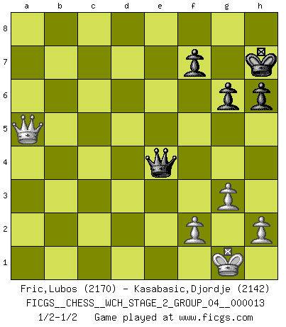 Last move : 1/2-1/2 2015 May 15 2:35:17 [Event "FICGS__CHESS__WCH_STAGE_2_GROUP_04__000013"] [Site "FICGS"] [Date "2014.12.09"] [Round "1"] [White "Fric,Lubos"] [Black "Kasabasic,Djordje"] [Result "1/2-1/2"] [WhiteElo "2170"] [BlackElo "2142"] 1.d4 Nf6 2.c4 g6 3.Nc3 d5 4.cxd5 Nxd5 5.e4 Nxc3 6.bxc3 Bg7 7.Nf3 c5 8.Rb1 O-O 9.Be2 cxd4 10.cxd4 Qa5+ 11.Bd2 Qxa2 12.O-O Bg4 13.Bg5 h6 14.Be3 Nc6 15.d5 Na5 16.Bc5 Bf6 17.e5 Bxe5 18.Rb4 Bxf3 19.Bxf3 Rfc8 20.Bxe7 Rc4 21.g3 Rxb4 22.Bxb4 Nc4 23.d6 Qb2 24.d7 Bf6 25.Re1 Ne5 26.Ba5 Qb5 27.Rxe5 Qxe5 28.d8Q+ Bxd8 29.Bxd8 a5 30.Bxb7 Rb8 31.Qd7 Qf5 32.Qe8+ Kh7 33.Be4 Rxd8 34.Qxd8 Qxe4 35.Qxa5 1/2-1/2 King's Indian defense, 3.Nc3 Kingside Castling by player Black (move 8) Kingside Castling by player White (move 12) Promotion Queen by player White (move 28) 10 pieces endgame at move 35 : White KQPPP , Black KQPPP WHITE : King + 1 Queen 3 Pawns BLACK : King + 1 Queen 3 Pawns This chess game ended in a draw. Follow this game move after move (download)Fischer, who may or may not be mad as a hatter, has every right to be horrified. (Jeremy Silman) Korrekt heißt in Deutschland die Haltung eines Mannes, dessen Benehmen nach dem Urteile seiner Nachbarn seiner Stellung angemessen ist. Um korrekt zu sein, muß man sich der Meinung der anderen anpassen... (Emanuel Lasker) Los asuntos humanos son como una partida de Ajedrez: solo aquellos que no lo toman seriamente, pueden ser llamados buenos jugadores. (Hung Tzu Ch'eng) J'ai vu le vaincu d'Echecs jouer des années durant dans l'espoir de la fête de la victoire. Car tu es plus riche de ce qu'elle existe si même elle n'est point pour toi. Ainsi de la perle du fond des mers. (Antoine de Saint-Exupéry) Establishing goals is all right if you don't let them deprive you of interesting detours. (Doug Larson)