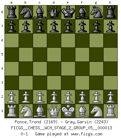 Last move : 0-1 2015 January 9 4:23:5 [Event "FICGS__CHESS__WCH_STAGE_2_GROUP_05__000013"] [Site "FICGS"] [Date "2014.12.09"] [Round "1"] [White "Ponce,Trond"] [Black "Gray,Garvin"] [Result "0-1"] [WhiteElo "2169"] [BlackElo "2243"] 0-1 This chess game has been lost on time (started : 2014.12.09 20:1:24) Player Black won this chess game. Follow this game move after move (download)Dazzling combinations are for the many, shifting wood is for the few. (Georg Kieninger) Das Schach hält seine Meister in eigenen Banden, Fesseln; auf vielerlei Weise formt es ihren Geist, so dass die innere Freiheit selbst des Stärksten beeinflusst wird. (Albert Einstein) Si pudieramos observar el interior de la cabeza de un jugador de Ajedrez, encontraríamos ahí un mundo lleno de sentimientos, imágenes, ideas, emoción y pasión. (Alfred Binet) Il n'y a pas eu de défaite parce que je ne crois pas que cet ordinateur ait jamais existé. IBM a triché en refusant d'imprimer les modes de recherche de la machine. C'est évident, pendant le match, des coups décisifs ont été joués par des êtres humains. Aujourd'hui, les meilleurs spécialistes en informatique ne peuvent toujours pas expliquer comment Deep-Blue a pu jouer contre la logique des ordinateurs. IBM a gagné une guerre de communication, mais ils sont incapables de prouver que l'ordinateur a gagné tout seul. (Garry Kasparov) Bobby never cared about money, though. His only desire was to prove that his choices were correct: He wanted chess to be important because he was a chess player, and he wanted to be important. Bobby knew money was important, but he didn't have a clue why, outside of clothes and status. The only way he could accomplish what he wanted was to fight for a lot of money. Once he got it, he gave it away. He did not know how to spend it. And once he'd become champion, after, essentially, sacrificing his life for it, he didn't know how to spend his time. (Bob Wade)