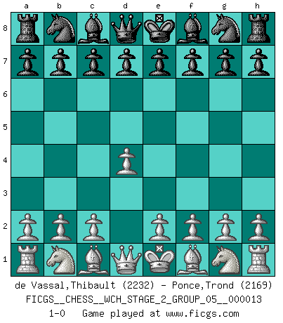 Last move : 1-0 2015 January 9 4:23:5 [Event "FICGS__CHESS__WCH_STAGE_2_GROUP_05__000013"] [Site "FICGS"] [Date "2014.12.09"] [Round "1"] [White "de Vassal,Thibault"] [Black "Ponce,Trond"] [Result "1-0"] [WhiteElo "2232"] [BlackElo "2169"] 1.d4 1-0 This chess game has been lost on time (started : 2014.12.09 20:1:24) Queen's pawn Player White won this chess game. Follow this game move after move (download)Chess is imagination. (David Bronstein) Über Frauen: Chess is better. (Robert James Fischer) Personalmente, yo prefiero mirar hacia el futuro en donde un programa de computadora gane el título mundial de Ajedrez. La humanidad necesita una lección de humildad. (Richard Dawkings) Une platitude souvent récitée à propos des Echecs est qu'une des choses les plus difficiles à réaliser est de gagner une position gagnante. Cela ne manque pas de sens mais, pour ma part, j'ai toujours trouvé plus difficile de gagner une position perdante. (Tim Krabbe) Go and wake up your luck. (Persian saying)