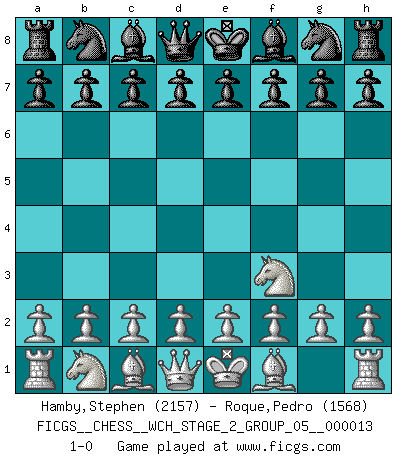 Last move : 1-0 2015 January 9 4:23:5 [Event "FICGS__CHESS__WCH_STAGE_2_GROUP_05__000013"] [Site "FICGS"] [Date "2014.12.09"] [Round "1"] [White "Hamby,Stephen"] [Black "Roque,Pedro"] [Result "1-0"] [WhiteElo "2157"] [BlackElo "1568"] 1.Nf3 1-0 This chess game has been lost on time (started : 2014.12.09 20:1:24) Reti Opening Player White won this chess game. Follow this game move after move (download)Every Pawn is a potential Queen. (James Mason) Der Traum, für den ich lebe, ist der von einem freien Russland. Viele mögen sagen: Russland hat doch ein Parlament, einen gewählten Präsidenten. Aber ich spüre, dass in meiner Heimat die Angst wiederkehrt. Eine Angst, sich frei zu äußern, bestimmte Dinge zu tun (Garry Kasparov) Todos los jugadores de Ajedrez deberían tener un pasatiempo. (Savielly Tartakower) Les Echecs sont et restent toujours un combat, un combat intégral comme la boxe, la lutte ou un autre sport, et où il doit y avoir un vainqueur et un vaincu. (Joseph Emil Diemer) Success without honor is an unseasoned dish; it will satisfy your hunger, but it won't taste good. (Joe Paterno)