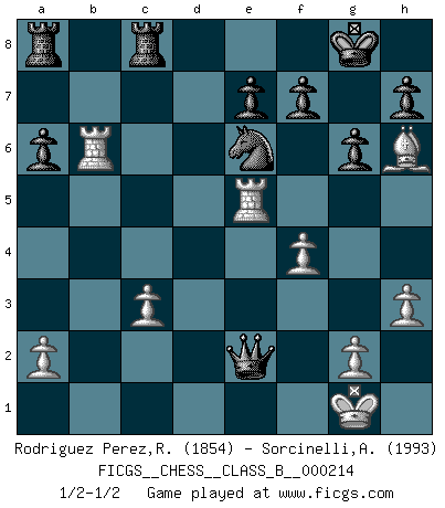 Last move : 1/2-1/2 2015 April 18 11:49:20 [Event "FICGS__CHESS__CLASS_B__000214"] [Site "FICGS"] [Date "2014.12.13"] [Round "1"] [White "Rodriguez Perez,Rene"] [Black "Sorcinelli,Andrea"] [Result "1/2-1/2"] [WhiteElo "1854"] [BlackElo "1993"] 1.e4 c5 2.Nf3 d6 3.d4 cxd4 4.Qxd4 a6 5.c4 Nc6 6.Qd3 g6 7.Nc3 Bg7 8.Be2 Nf6 9.O-O Bg4 10.h3 Bxf3 11.Qxf3 Nd7 12.Rb1 O-O 13.Qe3 Nd4 14.Rd1 Nxe2+ 15.Qxe2 Bxc3 16.bxc3 Qc7 17.Bh6 Rfb8 18.Rd5 b6 19.f4 Rc8 20.Rd4 Nc5 21.e5 Ne6 22.Re4 dxe5 23.Rxe5 Qxc4 24.Rxb6 Qxe2 1/2-1/2 Sicilian, Chekhover variation Kingside Castling by player White (move 9) Kingside Castling by player Black (move 12) This chess game ended in a draw. Follow this game move after move (download)When you don't know what to play, wait for an idea to come into your opponent's mind. You may be sure that idea will be wrong. (Siegbert Tarrasch) Es gibt nur zwei wahre Schachgenies - das andere war Wilhelm Steinitz, der Weltmeister von 1872 bis 1894. (Robert James Fischer) El ganar no lo es todo... pero el perder es nada. (Mednis) Le pion, dans sa simplicité, marche droit devant lui, mais lorsqu'il prend, il le fait obliquement? Ainsi l'homme, tant qu'il reste pauvre, marche dans la droiture et vit honnêtement, mais lorsqu'il recherche les honneurs, il flatte, se parjure et, par les voies obliques, cherche une position supérieure sur l'échiquier du monde. (Jean de Galles) Tomorrow's what you make of it. (Horatio Caine, C.S.I. Miami)