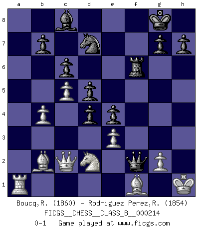 Last move : 0-1 2015 January 11 10:13:22 [Event "FICGS__CHESS__CLASS_B__000214"] [Site "FICGS"] [Date "2014.12.13"] [Round "1"] [White "Boucq,Romain"] [Black "Rodriguez Perez,Rene"] [Result "0-1"] [WhiteElo "1860"] [BlackElo "1854"] 1.c4 e6 2.Nc3 Nf6 3.e3 d5 4.d4 c6 5.Nf3 Nbd7 6.a3 Ne4 7.Bd3 f5 8.O-O Bd6 9.c5 Bc7 10.Qc2 O-O 11.b4 e5 12.Nd2 a5 13.Bb2 axb4 14.axb4 Rxa1 15.Rxa1 exd4 16.Ncxe4 fxe4 17.Bf1 Bxh2+ 18.Kxh2 Qh4+ 19.Kg1 Qxf2+ 20.Kh1 Rf6 0-1 English Opening Kingside Castling by player White (move 8) Kingside Castling by player Black (move 10) Player Black won this chess game. Follow this game move after move (download)When in doubt... play Chess ! (Tevis) Fallen sollten polizeilich verboten werden. (Savielly Grigorievitsch Tartakower) Mi estilo es algo parecido entre un poco de Tal y Petrosian. (Reshevsky) La vérité est comme le meilleur coup aux échecs : elle existe, mais il faut la chercher. (Arturo Perez-Reverte) The good fighters of old first put themselves beyond the possibility of defeat, and then waited for an opportunity of defeating the enemy. (Sun Tzu)