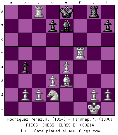 Last move : 1-0 2015 January 14 10:56:0 [Event "FICGS__CHESS__CLASS_B__000214"] [Site "FICGS"] [Date "2014.12.13"] [Round "1"] [White "Rodriguez Perez,Rene"] [Black "Harahap,Pongki Nangolngolan"] [Result "1-0"] [WhiteElo "1854"] [BlackElo "1800"] 1.e4 e5 2.Nf3 Nc6 3.Bb5 Nd4 4.Nxd4 exd4 5.O-O a6 6.Bc4 b5 7.Bxf7+ Kxf7 8.Qh5+ g6 9.Qd5+ Ke8 10.Qxa8 c6 11.d3 Qc7 12.Bf4 Qb7 13.Qxb7 Bxb7 14.Be5 Nf6 15.Bxf6 Rg8 16.Bxd4 Be7 17.f4 c5 18.Be3 b4 19.a3 a5 20.Nd2 Ba6 21.axb4 cxb4 22.Rxa5 Bc8 23.f5 gxf5 24.Ra8 Kf7 25.Rxf5+ Ke8 26.Rxc8+ 1-0 Ruy Lopez : Bird's defense Kingside Castling by player White (move 5) Player White won this chess game. Follow this game move after move (download)The stomach is an essential part of the Chess master. (Bent Larsen) Eine Person mit durchschnittlichem IQ kann etwa eine ELO von 2000 erreichen. (Jonathan Levitt) ¿Se han dado cuenta de que Fischer casi nunca ha tenido piezas malas? El las intercambia y las piezas malas se quedan con sus oponenets. (Yuri Balashov) Le plus grand jeu de l'esprit jamais inventé, plus vous l'apprenez, plus vous y prenez du plaisir. (Garry Kasparov) If you are good, you will be assigned all the work. If you are really good, you will get out of it. (Dan Rotaru)