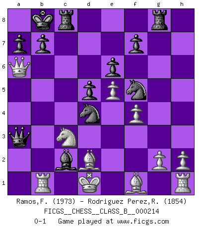 Last move : 0-1 2015 January 27 13:20:53 [Event "FICGS__CHESS__CLASS_B__000214"] [Site "FICGS"] [Date "2014.12.13"] [Round "1"] [White "Ramos,Francis"] [Black "Rodriguez Perez,Rene"] [Result "0-1"] [WhiteElo "1973"] [BlackElo "1854"] 1.e4 e6 2.d4 d5 3.Nc3 Bb4 4.e5 c5 5.a3 Bxc3+ 6.bxc3 Qc7 7.Qg4 Ne7 8.Qxg7 Rg8 9.Qxh7 cxd4 10.Ne2 Nbc6 11.f4 Bd7 12.Qd3 dxc3 13.Nxc3 Nf5 14.Bd2 Ncd4 15.a4 O-O-O 16.Rb1 Kb8 17.Rb4 Qc5 18.Rb2 Rc8 19.Kd1 Qa3 20.Rb1 Bxa4 21.Qa6 Bxc2+ 0-1 French : Winawer, Classical variation Queenside Castling by player Black (move 15) Player Black won this chess game. Follow this game move after move (download)Some sacrifices are sound; the rest are mine. (Mikhail Tal) Je älter ich werde, um so mehr schätze ich die Bauern. (Paul Keres) El poder defensivo de una pieza clavada, solamente es imaginario. (Aaron Nimzovich) Nous vivons dans un monde échiquéen : chaque jour qui passe est un défi à relever. (Philosophe Sasha) All art requires courage. (Anne Tucker)