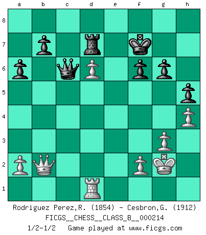 Last move : 1/2-1/2 2015 March 30 18:31:30 [Event "FICGS__CHESS__CLASS_B__000214"] [Site "FICGS"] [Date "2014.12.13"] [Round "1"] [White "Rodriguez Perez,Rene"] [Black "Cesbron,Guy"] [Result "1/2-1/2"] [WhiteElo "1854"] [BlackElo "1912"] 1.e4 c6 2.d4 d5 3.e5 c5 4.dxc5 e6 5.Be3 Nd7 6.Bb5 Qc7 7.Nf3 Bxc5 8.Bxc5 Qxc5 9.c4 dxc4 10.Nc3 a6 11.Bxd7+ Bxd7 12.Ne4 Qa5+ 13.Kf1 Bc6 14.Nd6+ Kf8 15.Nxc4 Bb5 16.b3 Rd8 17.Qc2 Ne7 18.g3 g6 19.Kg2 Bxc4 20.bxc4 Kg7 21.Rab1 Rd7 22.h4 h5 23.Rhd1 Rhd8 24.Rd6 Nf5 25.c5 Nxd6 26.exd6 Rc8 27.Qb2+ f6 28.Ng5 Rxc5 29.Nxe6+ Kf7 30.Nxc5 Qxc5 31.Rd1 Qc6+ 1/2-1/2 Caro-Kann : Advance variation This chess game ended in a draw. Follow this game move after move (download)A good sacrifice is one that is not necessarily sound but leaves your opponent dazed and confused. (Rudolph Spielmann) Wenn ein Kopf und ein Buch zusammenstoßen und es klingt hohl, ist es denn allemal im Buche? (Georg Christoph Lichtenberg) El Ajedrez es tan inspirador que yo no creo que un buen jugador sea capaz de tener un pensamiento malo durante una partida. (Wilhelm Steinitz) Les échecs sont utiles à l'exercice de la faculté de penser et à celle de l'imagination. Car nous devons posséder une méthode élaborée pour atteindre des buts partout où nous devons conduire notre raison. (Leibnitz) The faster the computer, the slower the brain. (Thibault de Vassal)