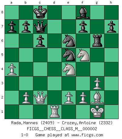 Last move : 1-0 2006 October 5 4:56:22 [Event "FICGS__CHESS__CLASS_M__000002"] [Site "FICGS"] [Date "2006.04.10"] [Round "1"] [White "Rada,Hannes"] [Black "Crozey,Antoine"] [Result "1-0"] [WhiteElo "2409"] [BlackElo "2332"] 1.Nf3 Nf6 2.c4 c6 3.d4 d5 4.Nc3 dxc4 5.a4 Bf5 6.Ne5 Nbd7 7.Nxc4 Qc7 8.g3 e5 9.dxe5 Nxe5 10.Bf4 Nfd7 11.Bg2 g5 12.Ne3 gxf4 13.Nxf5 O-O-O 14.Qc2 Nc5 15.O-O Ne6 16.Qe4 fxg3 17.hxg3 Rg8 18.Rad1 Rxd1 19.Rxd1 Rg4 20.Qc2 Rg6 21.Ne4 1-0 Reti Opening Queenside Castling by player Black (move 13) Kingside Castling by player White (move 15) Player White won this chess game. Follow this game move after move (download)It is the aim of the modern school, not to treat every position according to one general law, but according to the principle inherent in the position. (Richard Reti) Im Leben werden Partien nie so unstrittig gewonnen wie im Spiel (Emanuel Lasker) No existe un remordimiento como el remordimiento del Ajedrez. (H. G. Wells) L'ordinateur a tué l'originalité. Il n'y a plus guère d'aventures sur l'échiquier. (Jacob Murray) If you know the enemy and know yourself you need not fear the results of a hundred battles. (Sun Tzu)