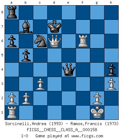 Last move : 1-0 2015 February 12 0:20:32 [Event "FICGS__CHESS__CLASS_A__000158"] [Site "FICGS"] [Date "2014.12.13"] [Round "1"] [White "Sorcinelli,Andrea"] [Black "Ramos,Francis"] [Result "1-0"] [WhiteElo "1993"] [BlackElo "1973"] 1.e4 c5 2.Nf3 d6 3.d4 cxd4 4.Nxd4 Nf6 5.Nc3 a6 6.Bg5 Qb6 7.Bxf6 gxf6 8.Nd5 Qd8 9.c3 e6 10.Ne3 h5 11.Be2 h4 12.h3 Bh6 13.Ng4 Bf4 14.Bc4 Nc6 15.Ne2 Bg5 16.f4 Bh6 17.Nxh6 Rxh6 18.Qd2 b5 19.Bb3 Rg6 20.O-O Bb7 21.f5 Rg5 22.fxe6 fxe6 23.Nf4 Re5 24.Nxe6 Qe7 25.Qh6 Rxe6 26.Bxe6 Qxe6 27.Rxf6 Qxe4 28.Qf8+ Kd7 29.Qxd6+ 1-0 Sicilian : Najdorf, 6.Bg5 Kingside Castling by player White (move 20) Player White won this chess game. Follow this game move after move (download)A thorough understanding of the typical mating continuations makes the most complicated sacrificial combinations leading up to them not only not difficult, but almost a matter of course. (Siegbert Tarrasch) Karpov ist ein Museumsstück. (Garry Kasparov) Cuando me preguntan: -¿Cual es el secreto que te hace hacer mejores movidas que tus oponentes?, Yo respondo: Me da gusto que me pregunten eso, porque, como veran, hay una simple razón. Yo pienso mis propias movidas y dejo a mi oponente que el piense las suyas. (Alexander Alekhine) Ce qui caractérise les parties de combat, c'est que si le défenseur a constamment de difficiles problèmes à résoudre, l'attaquant doit chercher sans relâche de nouvelles possibilités d'attaque. (Koblentz) There's no money in correspondence chess. (John Knudsen)