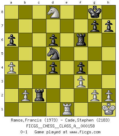 Last move : 0-1 2015 January 26 17:4:31 [Event "FICGS__CHESS__CLASS_A__000158"] [Site "FICGS"] [Date "2014.12.13"] [Round "1"] [White "Ramos,Francis"] [Black "Cade,Stephen"] [Result "0-1"] [WhiteElo "1973"] [BlackElo "2183"] 1.e4 c5 2.Nf3 d6 3.d4 cxd4 4.Nxd4 Nf6 5.Nc3 a6 6.f3 e5 7.Nb3 Be6 8.Nd5 Nxd5 9.exd5 Bf5 10.Be2 Nd7 11.Be3 Be7 12.O-O O-O 13.Bd3 Bxd3 14.Qxd3 Bg5 15.Rae1 Bxe3+ 16.Rxe3 f5 17.Rfe1 Rc8 18.a4 Nb6 19.Na5 f4 20.Re4 Qc7 21.Kh1 Qxc2 22.Qxc2 Rxc2 23.Nxb7 Rf6 24.Nd8 Nxd5 25.Rd4 exd4 0-1 Sicilian : Najdorf Kingside Castling by player White (move 12) Kingside Castling by player Black (move 12) Player Black won this chess game. Follow this game move after move (download)The older I grow, the more I value pawns. (Paul Keres) Es ist peinlich, dass ich nie Weltmeister wurde. Es wäre leicht, Leonid Breschnjew als Ursache vorzuschieben, dessen Apparat den Vorzeigekommunisten Anatoli Karpow in allem unterstützte. Aber Garri Kasparow zum Beispiel, der ebenfalls von den Sowjets unerwünscht war, hat trotz der Widerstände den WM-Titel erobert. (Viktor Kortschnoi) El Ajedrez es imaginación. (David Bronstein) Un millionnaire : 'Monsieur Steinitz ! Vous ne participez aux tournois que pour l'argent, alors que moi je n'y viens que pour l'honneur.' Steinitz : 'Chacun joue pour ce qu'il n'a pas'... Go and wake up your luck. (Persian saying)