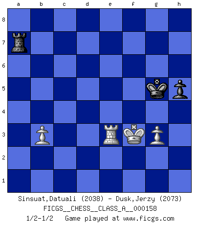 Last move : 1/2-1/2 2015 April 22 7:23:35 [Event "FICGS__CHESS__CLASS_A__000158"] [Site "FICGS"] [Date "2014.12.13"] [Round "1"] [White "Sinsuat,Datuali"] [Black "Dusk,Jerzy"] [Result "1/2-1/2"] [WhiteElo "2038"] [BlackElo "2073"] 1.e4 e5 2.Nf3 Nc6 3.Bb5 a6 4.Ba4 Nf6 5.O-O Be7 6.Re1 b5 7.Bb3 d6 8.c3 O-O 9.h3 Na5 10.Bc2 c5 11.d4 Qc7 12.Nbd2 cxd4 13.cxd4 Nc6 14.a3 exd4 15.Nb3 Re8 16.Bf4 Bd7 17.Nbxd4 Qb7 18.Bb3 Na5 19.e5 dxe5 20.Nxe5 Nxb3 21.Qxb3 Qd5 22.Qxd5 Nxd5 23.Nxd7 Nxf4 24.Nf5 Ng6 25.g3 f6 26.Rac1 Ra7 27.Nb6 Ne5 28.Rxe5 fxe5 29.Nc8 Rxc8 30.Rxc8+ Bf8 31.Nd6 Rd7 32.Ne4 Kf7 33.Ra8 h6 34.Rxa6 Rd4 35.Ra7+ Ke6 36.Nc3 b4 37.axb4 Rxb4 38.Nd1 Be7 39.h4 h5 40.Kg2 Rb6 41.Rc7 Bf6 42.Rc8 Rb4 43.Rc2 Be7 44.Rc6+ Kf7 45.Rc7 Ke6 46.Kh3 Rb6 47.Rc8 Kf7 48.Rc3 Ke6 49.b3 Bb4 50.Rd3 Bc5 51.Ne3 Rb7 52.Kg2 Bd4 53.f4 exf4 54.Rxd4 fxe3 55.Re4+ Kf5 56.Rxe3 g5 57.hxg5 Kxg5 58.Kf3 Ra7 1/2-1/2 Ruy Lopez : Closed Kingside Castling by player White (move 5) Kingside Castling by player Black (move 8) 10 pieces endgame at move 54 : White KRPPP , Black KRPPP WHITE : King + 1 Rook 3 Pawns BLACK : King + 1 Rook 3 Pawns 9 pieces endgame at move 56 : White KRPPP , Black KRPP WHITE : King + 1 Rook 3 Pawns BLACK : King + 1 Rook 2 Pawns 8 pieces endgame at move 57 : White KRPPP , Black KRP WHITE : King + 1 Rook 3 Pawns BLACK : King + 1 Rook 1 Pawn 7 pieces endgame at move 57 : White KRPP , Black KRP WHITE : King + 1 Rook 2 Pawns BLACK : King + 1 Rook 1 Pawn This chess game ended in a draw. Follow this game move after move (download)When asked, -How is that you pick better moves than your opponents?, I responded: I'm very glad you asked me that, because, as it happens, there is a very simple answer. I think up my own moves, and I make my opponent think up his. (Alexander Alekhine) Wenn Dein Gegner dir ein Remis anbietet, versuch herauszufinden, weshalb er glaubt schlechter zu stehen. (Nigel Short) El Ajedrez es tan inspirador que yo no creo que un buen jugador sea capaz de tener un pensamiento malo durante una partida. (Wilhelm Steinitz) Le joueur d'Echecs qui veut atteindre le top est obligé de développer son propre credo créatif. Alexeï Stepanovicth Souétine. Il est facile d'écrire des livres ! Ce qui est difficile, c'est de jouer ! (Alexeï Stepanovicth Souétine) A government big enough to give you everything you want is strong enough to take everything you have. (Thomas Jefferson)