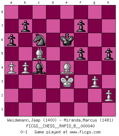 Last move : 0-1 2007 May 23 10:42:41 [Event "FICGS__CHESS__RAPID_B__000040"] [Site "FICGS"] [Date "2007.02.27"] [Round "1"] [White "Weidemann,Jaap"] [Black "Miranda,Marcus"] [Result "0-1"] [WhiteElo "1400"] [BlackElo "1481"] 1.c4 e6 2.d4 d5 3.Nc3 c5 4.cxd5 exd5 5.dxc5 d4 6.Na4 Bxc5 7.Nxc5 Qa5+ 8.Bd2 Qxc5 9.Rc1 Qf5 10.Qa4+ Nc6 11.Nf3 Nge7 12.Nxd4 Qe4 13.e3 O-O 14.f3 Qh4+ 15.g3 Qf6 16.Bg2 Nxd4 17.Qxd4 Qxd4 18.exd4 Rd8 19.f4 Rxd4 20.Be3 Rd3 21.Kf2 Be6 22.Rhd1 Rxd1 23.Rxd1 Nc6 24.a3 a6 25.Bf3 g6 26.b4 h5 27.Bg2 Rc8 28.Be4 Kg7 29.Bb6 Bg4 30.Rd6 Re8 31.Bd3 Re6 32.Rd7 Re2+ 33.Bxe2 Bxd7 34.Bf3 Kf6 35.Ke3 Bg4 36.Bg2 Be6 37.Bc5 Bb3 38.Be4 Bc4 39.a4 Ke6 40.f5+ gxf5 0-1 This chess game has been lost on time (started : 2007.02.27 14:52:53) English Opening Kingside Castling by player Black (move 13) Player Black won this chess game. Follow this game move after move (download)Nowadays, when you're not a grandmaster at 14, you can forget about it. (Anand Viswanathan) Man kann eine Schachpartie nur gewinnen, wenn das Gleichgewicht gestört ist. In einer Stellung mit ungestörtem Gleichgewicht ist auch das größte Genie hilflos - in der Stellung steckt dann eben kein genialer Einfall. (Wilhelm Steinitz) A la fecha, Fischer esta simplemente un nivel arriba de todos los mejores jugadores de Ajedrez del mundo. (John Jacobs) Les Echecs ont trois composantes : le temps, l'espace et le matériel en dernier. (Mikhail Tal) There are two kinds of people in the world, my friend. Those who have a loaded gun and those who dig. You dig ! (Blondie in The Good, The Bad and The Ugly)