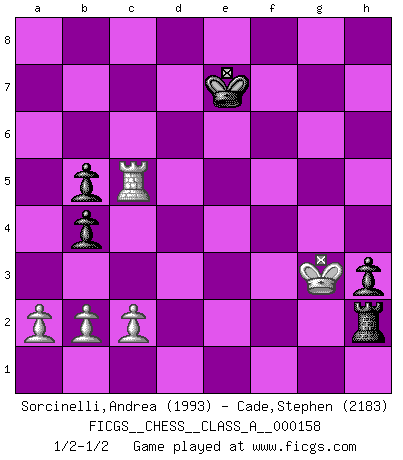 Last move : 1/2-1/2 2015 April 6 11:27:42 [Event "FICGS__CHESS__CLASS_A__000158"] [Site "FICGS"] [Date "2014.12.13"] [Round "1"] [White "Sorcinelli,Andrea"] [Black "Cade,Stephen"] [Result "1/2-1/2"] [WhiteElo "1993"] [BlackElo "2183"] 1.e4 c5 2.Nf3 d6 3.d4 cxd4 4.Nxd4 Nf6 5.Nc3 a6 6.Bg5 e6 7.f4 Qc7 8.Bxf6 gxf6 9.Qd2 b5 10.Be2 b4 11.Nd1 Nc6 12.Ne3 Bb7 13.O-O-O Nxd4 14.Qxd4 Qc5 15.Bf3 Rc8 16.Rhe1 Be7 17.Qxc5 dxc5 18.Nc4 Bc6 19.Kd2 Bb5 20.Be2 Rg8 21.g3 h5 22.Ke3 h4 23.g4 Rd8 24.h3 Rxd1 25.Rxd1 f5 26.g5 f6 27.Nd6+ Bxd6 28.Bxb5+ axb5 29.Rxd6 Ke7 30.Rc6 fxg5 31.exf5 exf5 32.fxg5 Rxg5 33.Kf4 Rg3 34.Rxc5 Rxh3 35.Kxf5 Rh2 36.Kg4 h3 37.Kg3 1/2-1/2 Sicilian : Najdorf, 7.f4 Queenside Castling by player White (move 13) 10 pieces endgame at move 35 : White KRPPP , Black KRPPP WHITE : King + 1 Rook 3 Pawns BLACK : King + 1 Rook 3 Pawns This chess game ended in a draw. Follow this game move after move (download)Chess is a forcing house where the fruits of character can ripen more fully than in life. (Edward Morgan Foster) Die Neutralität betrachte ich als eine schwere Krankheit. (Viktor Kortschnoi) La única cosa que los jugadores de Ajedrez tienen en común, es el Ajedrez. (Lodewijk Prins) Avant la finale, les dieux ont créé le milieu de partie. (Tarrasch) You lose, general Kenobi. (General Grievous in Star Wars ep.3)
