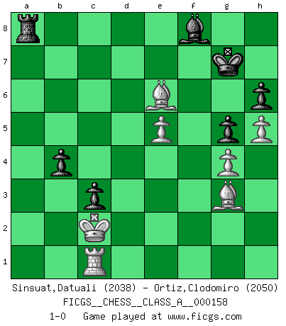 Last move : 1-0 2015 May 8 2:42:40 [Event "FICGS__CHESS__CLASS_A__000158"] [Site "FICGS"] [Date "2014.12.13"] [Round "1"] [White "Sinsuat,Datuali"] [Black "Ortiz,Clodomiro"] [Result "1-0"] [WhiteElo "2038"] [BlackElo "2050"] 1.e4 e5 2.Nf3 Nf6 3.d4 Nxe4 4.Nxe5 d5 5.Qf3 Qf6 6.Qxf6 Nxf6 7.Be3 Nbd7 8.Bd3 Bd6 9.f4 Ne4 10.c4 Bb4+ 11.Ke2 Nd6 12.c5 Nxe5 13.fxe5 Nc4 14.Bc1 Nxe5 15.dxe5 Bxc5 16.Be3 Be7 17.Rf1 Bg4+ 18.Kf2 c5 19.Kg1 a6 20.Bf2 O-O 21.Nc3 Rad8 22.h3 Be6 23.Ne2 Rc8 24.Nf4 Bg5 25.Nxe6 fxe6 26.h4 Bd8 27.b3 b5 28.Be2 Rc6 29.a4 b4 30.Rfc1 Be7 31.g3 Rfc8 32.Rab1 g5 33.h5 Bf8 34.a5 Bg7 35.Re1 Rb8 36.Kg2 Re8 37.Bd3 h6 38.g4 Rf8 39.Bg3 Rfc8 40.Rf1 R6c7 41.Be2 Rc6 42.Kf2 Rb8 43.Ke3 Rd8 44.Rfd1 Rd7 45.Kd3 Rdc7 46.Kc2 Kf7 47.Rf1+ Kg8 48.Rb2 Rc8 49.Kb1 R6c7 50.Rc1 Bf8 51.Rbc2 Rc6 52.Be1 Rb8 53.Bf2 Rbc8 54.Be3 R8c7 55.Bd3 Rc8 56.Ka2 R8c7 57.Bd4 Rc8 58.Kb2 Be7 59.Be3 Bf8 60.Bg1 R8c7 61.Bg6 Rc8 62.Rf2 Bg7 63.Bf7+ Kh8 64.Re1 Rf8 65.Bg6 Rxf2+ 66.Bxf2 Kg8 67.Kb1 Rc8 68.Rc1 Bf8 69.Bd3 Kg7 70.Be1 Rd8 71.Bg3 Rc8 72.Rf1 c4 73.bxc4 dxc4 74.Rc1 c3 75.Bxa6 Rc5 76.Kc2 Rxa5 77.Bc4 Ra8 78.Bxe6 1-0 Comment by player 1 : Datuali Sinsuat : Well, this is already loss for black :) Comment by player 2 : Clodomiro Ortiz : black has time to look for the best move Petrov : Modern attack, Symmetrical variation Kingside Castling by player Black (move 20) Player White won this chess game. Follow this game move after move (download)Chess problems demand from the composer the same virtues that characterize all worthwhile art: originality, invention, conciseness, harmony, complexity, and splendid insincerity. (Vladimir Nabokov) Der Partner hat auch seine Existenzberechtigung. (Savielly Grigorievitsch Tartakower) Los finales de Peón son del Ajedrez lo que el cesped es del Golf. (Cecil Purdy) Ne tendez aucun piège pour le plaisir ! Ne jouez rien dans l'espoir que l'adversaire réagisse de façon stupide ! Prenez toujours pour acquis que l'adversaire va trouver le meilleur coup ! Ne jouez jamais de coup dans l'espoir que l'adversaire ne voie pas la menace ! Chacun de vos coups doit améliorer la position d'une façon ou d'une autre. Sometimes it pays to stay in bed in Monday, rather than spending the rest of the week debugging Monday's code. (Dan Salomon)
