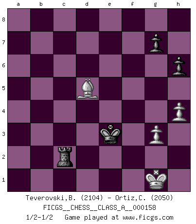 Last move : 1/2-1/2 2015 February 23 14:11:54 [Event "FICGS__CHESS__CLASS_A__000158"] [Site "FICGS"] [Date "2014.12.13"] [Round "1"] [White "Teverovski,Bogoljub"] [Black "Ortiz,Clodomiro"] [Result "1/2-1/2"] [WhiteElo "2104"] [BlackElo "2050"] 1.Nf3 d5 2.c4 e6 3.g3 Nf6 4.Bg2 c6 5.O-O Nbd7 6.b3 Be7 7.Bb2 b5 8.d3 O-O 9.Nbd2 Bb7 10.Qc2 a5 11.a3 Qb8 12.e4 Rc8 13.Rfc1 dxe4 14.dxe4 a4 15.bxa4 Rxa4 16.Bf1 Qa7 17.Rd1 Ng4 18.Nb3 Ngf6 19.Bxf6 Nxf6 20.e5 Ne8 21.c5 h6 22.h4 Ba8 23.Nfd2 Nc7 24.Ne4 Nd5 25.Nd6 Rf8 26.Be2 Bb7 27.Bh5 Bxd6 28.exd6 Bc8 29.Qb2 Bd7 30.Re1 f6 31.f4 Rc4 32.Bf3 Qa4 33.Bg2 e5 34.fxe5 fxe5 35.Rxe5 Rg4 36.Rxd5 cxd5 37.Qc3 Kh8 38.Qe3 Bc6 39.Qd3 b4 40.axb4 Qxb4 41.Rb1 Qa3 42.Rd1 Rb8 43.Qf3 Rg6 44.Rd3 Rf6 45.Qd1 Ba4 46.Bxd5 Bxb3 47.Rxb3 Rxb3 48.Qxb3 Qxc5+ 49.Kh2 Rf2+ 50.Bg2 Qc6 51.Qb8+ Kh7 52.Qb1+ Rc2 53.Qf1 Qxd6 54.Qf3 Rd2 55.Qe4+ Qg6 56.Qxg6+ Kxg6 57.Kg1 Kf5 58.Bf3 Rb2 59.Kf1 Rb6 60.Kf2 Rb8 61.Kg1 Ke5 62.Kf2 Rb2+ 63.Kf1 Kd6 64.Kg1 Kc5 65.Kf1 Kd4 66.Kg1 Ke3 67.Bd5 Rc2 1/2-1/2 Reti Opening Kingside Castling by player White (move 5) Kingside Castling by player Black (move 8) 10 pieces endgame at move 53 : White KQBPP , Black KQRPP WHITE : King + 1 Queen 1 Bishop 2 Pawns BLACK : King + 1 Queen 1 Rook 2 Pawns 9 pieces endgame at move 56 : White KQBPP , Black KRPP WHITE : King + 1 Queen 1 Bishop 2 Pawns BLACK : King + 1 Rook 2 Pawns 8 pieces endgame at move 56 : White KBPP , Black KRPP WHITE : King + 1 Bishop 2 Pawns BLACK : King + 1 Rook 2 Pawns This chess game ended in a draw. Follow this game move after move (download)All my games are real. (Bobby Fischer) Wenn ich Weiß habe gewinne ich weil ich Weiß habe, wenn ich Schwarz habe gewinne ich weil ich Bogoljubov bin. (Efim Bogoljubov) Si no le temes a Spassky, entonces elimino el elemento del dinero. (Jim Slater) J'ai toujours senti une vague pitié pour l'homme qui ne connaît rien aux échecs, tout comme j'en aurais pour un homme ignorant de l'amour. Les Echecs, comme la musique ou comme l'amour, ont le pouvoir de rendre heureux. (Siegbert Tarrasch) The difference between stupidity and genius is that genius has its limits. (Murphy)